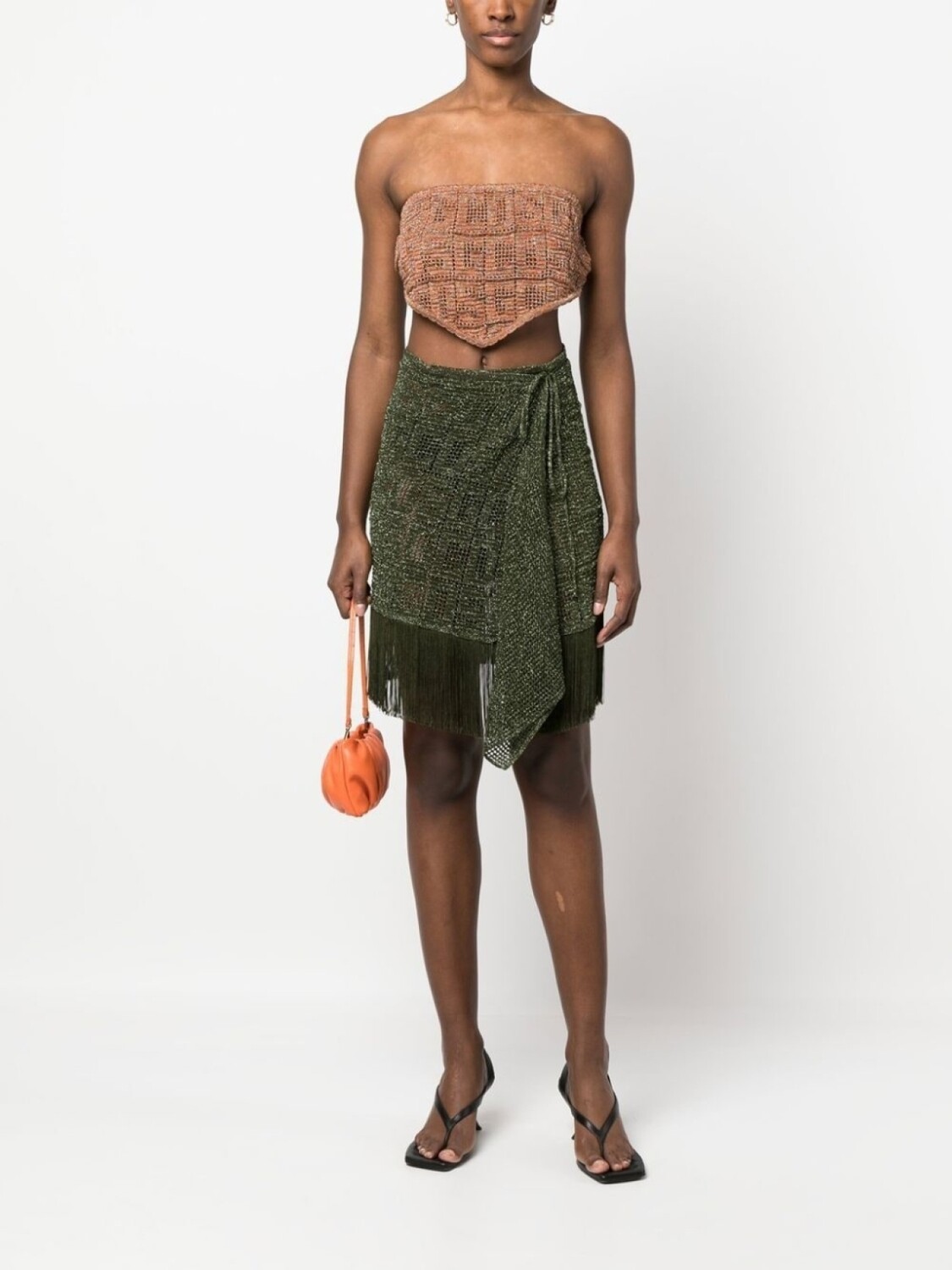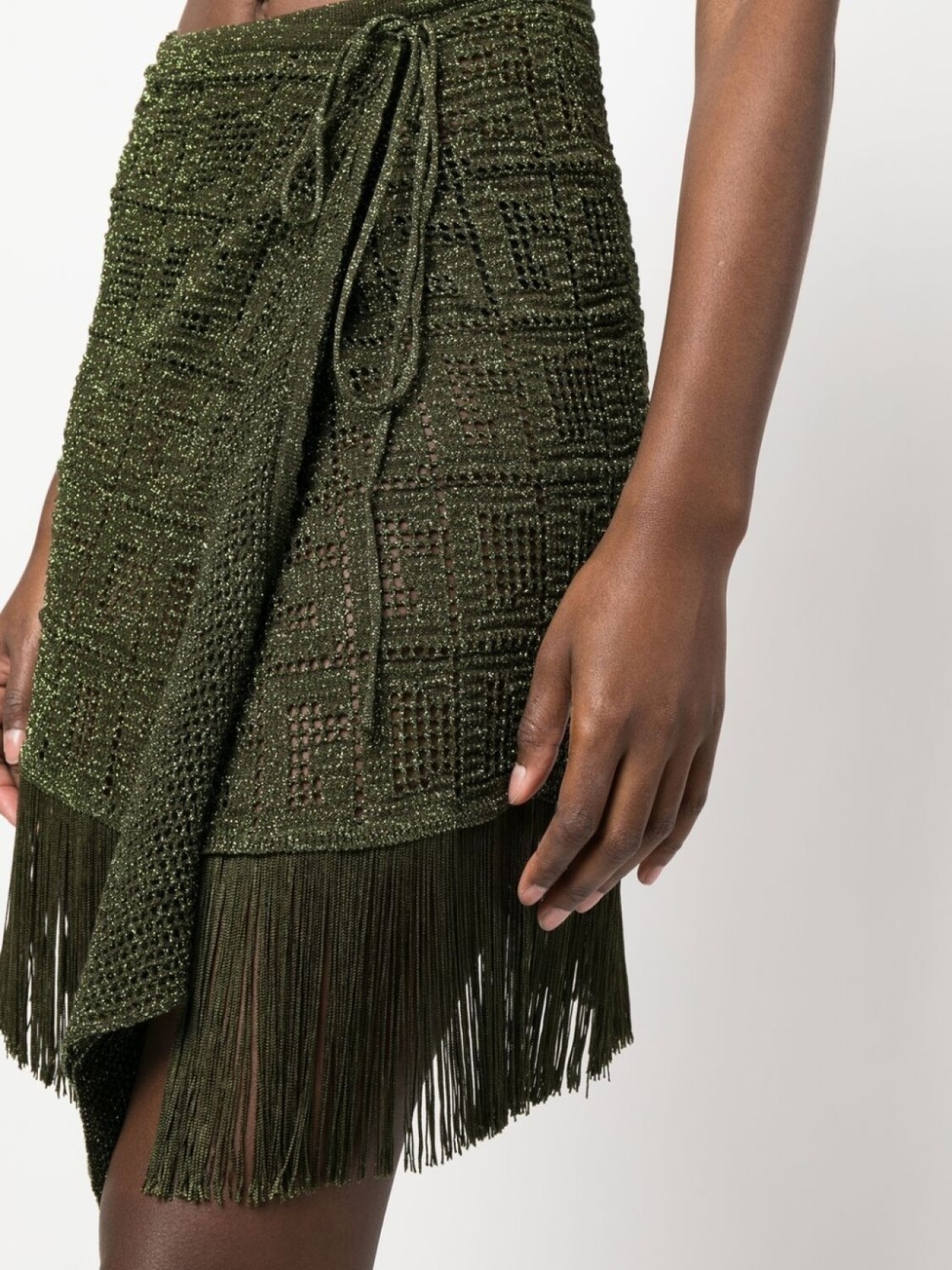 Оливково-зеленый, люрекс, отделка в технике макраме, полупрозрачный дизайн, модель на запах, завязки по бокам и края с бахромой.
