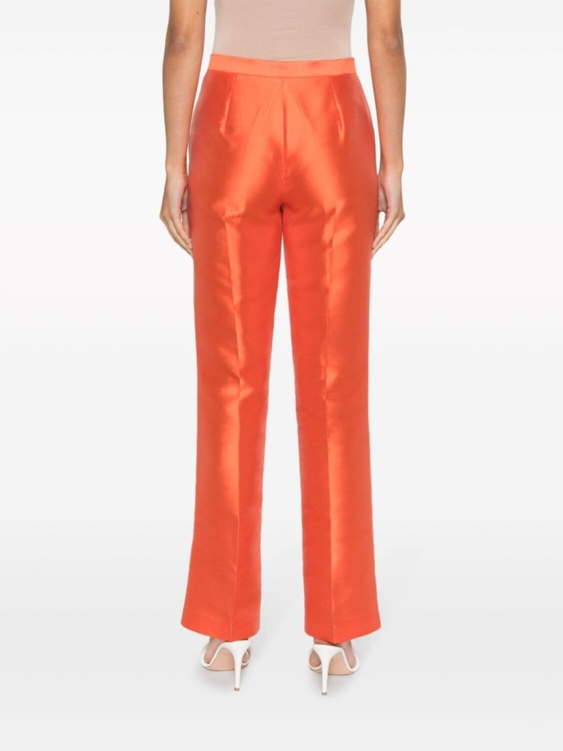 Морковный, сатиновая фактура, средняя посадка, потайная пуговичная застежка спереди, защипы, стрелки и прямой крой.