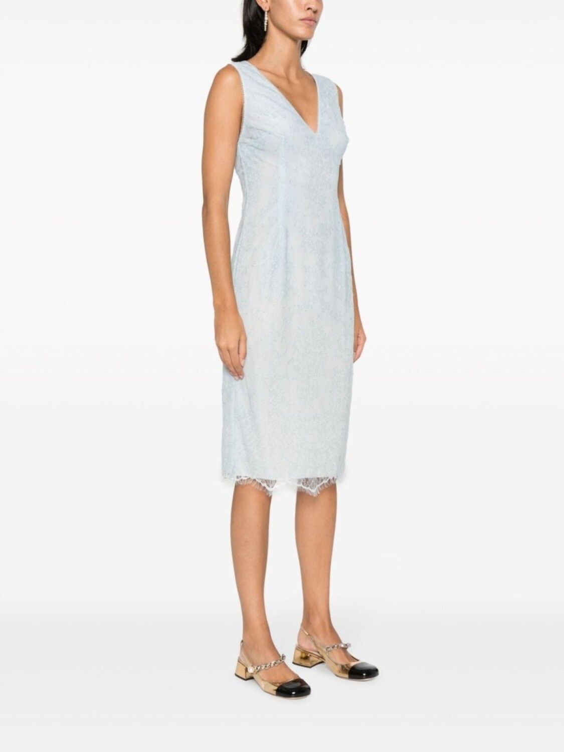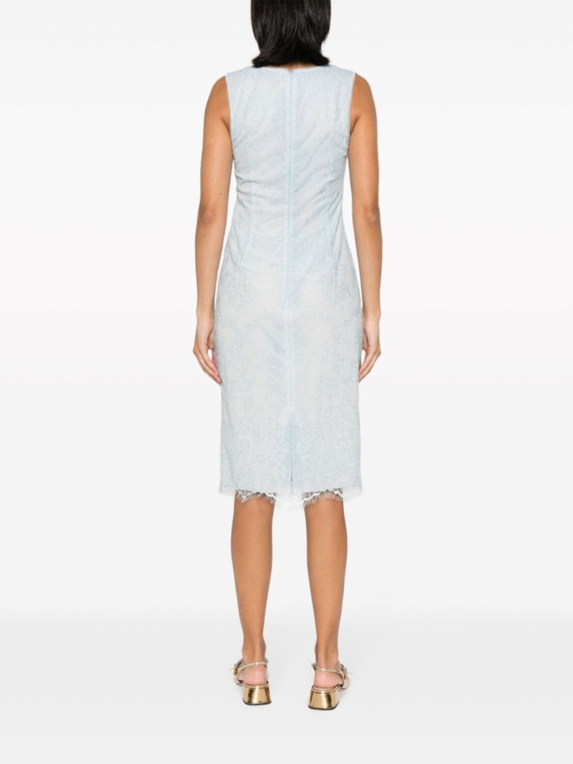 Голубой, кружево шантильи, круглый вырез, без рукавов, цельная подкладка, шлица по центру сзади и длина миди.