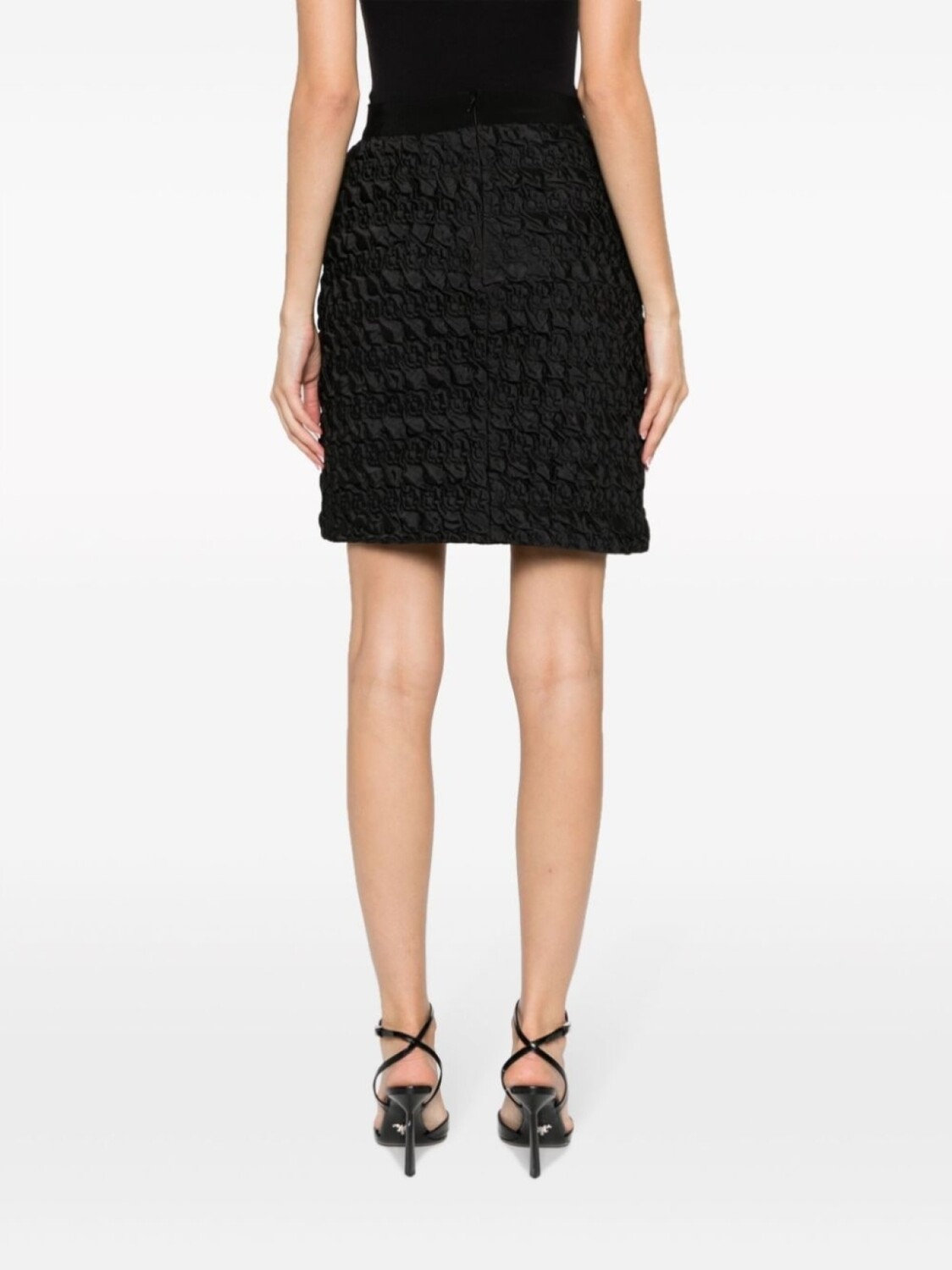Черный, отделка с тиснением, эластичный пояс, длина выше колена и застежка на молнии сзади.
