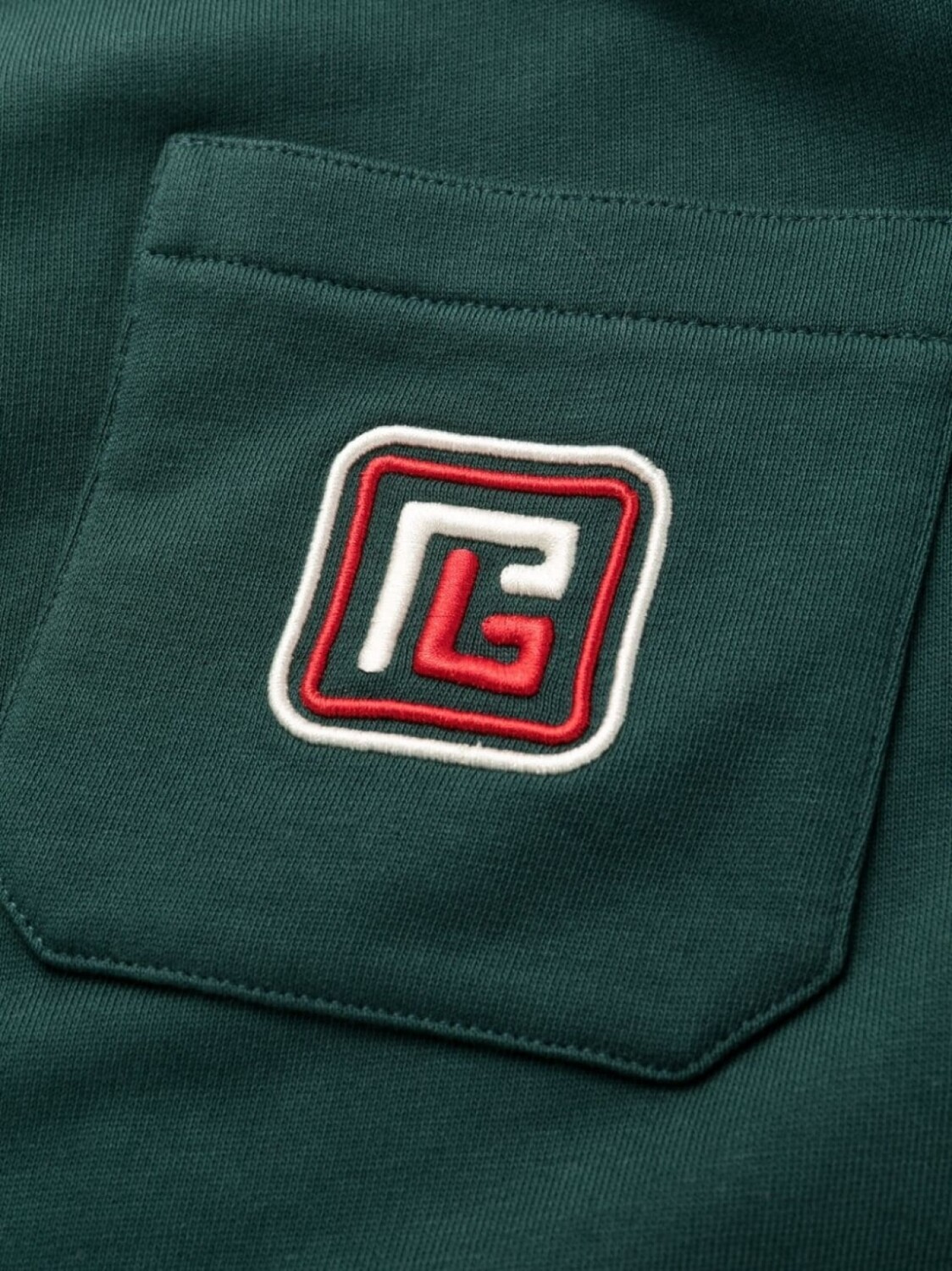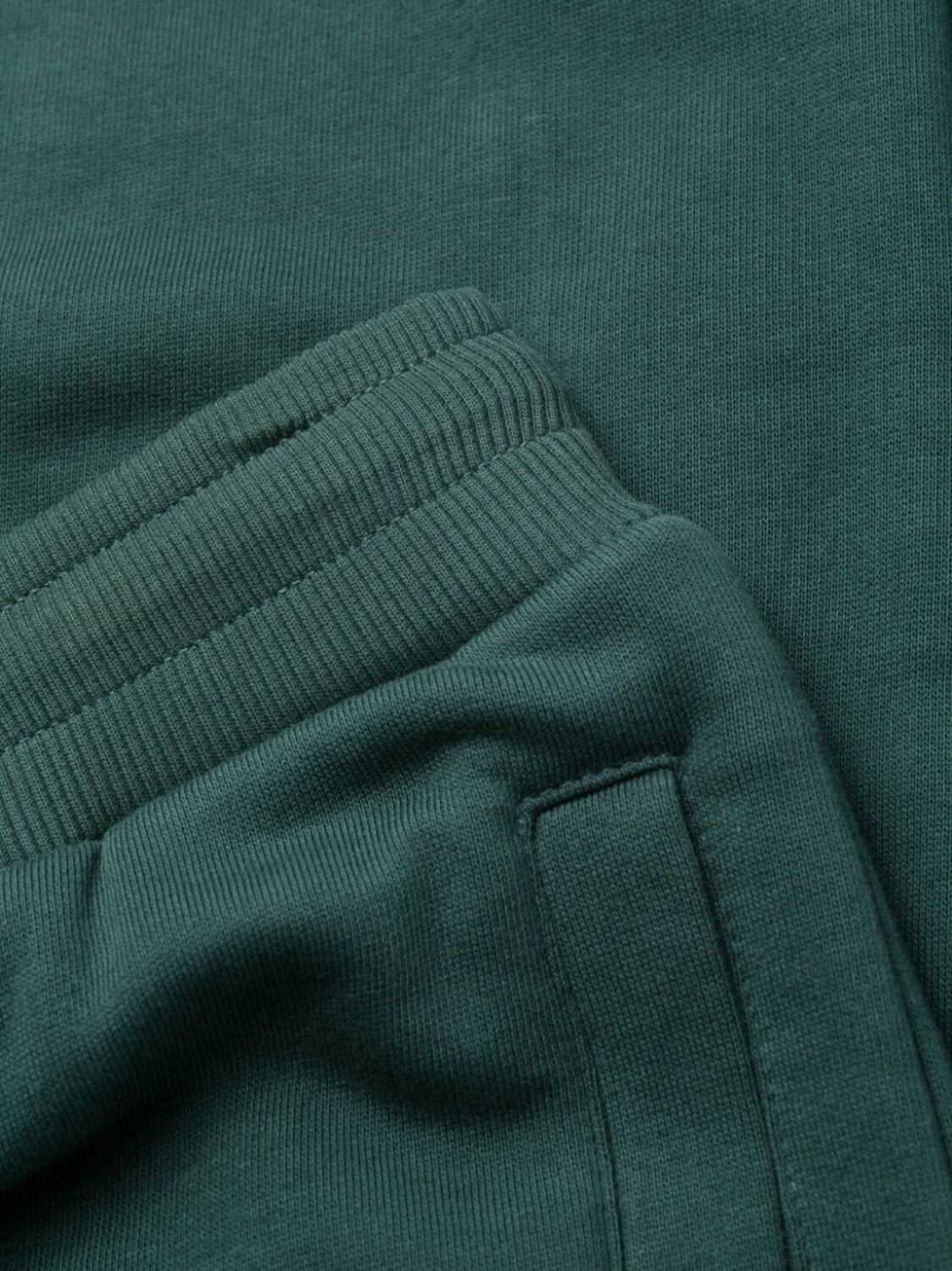 Насыщенный зеленый, хлопок, нашивка с логотипом сзади, серебристая фурнитура, кулиска на талии, два прорезных кармана по бокам, два накладных кармана сзади и узкий крой.