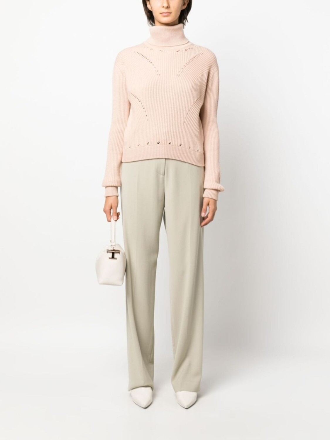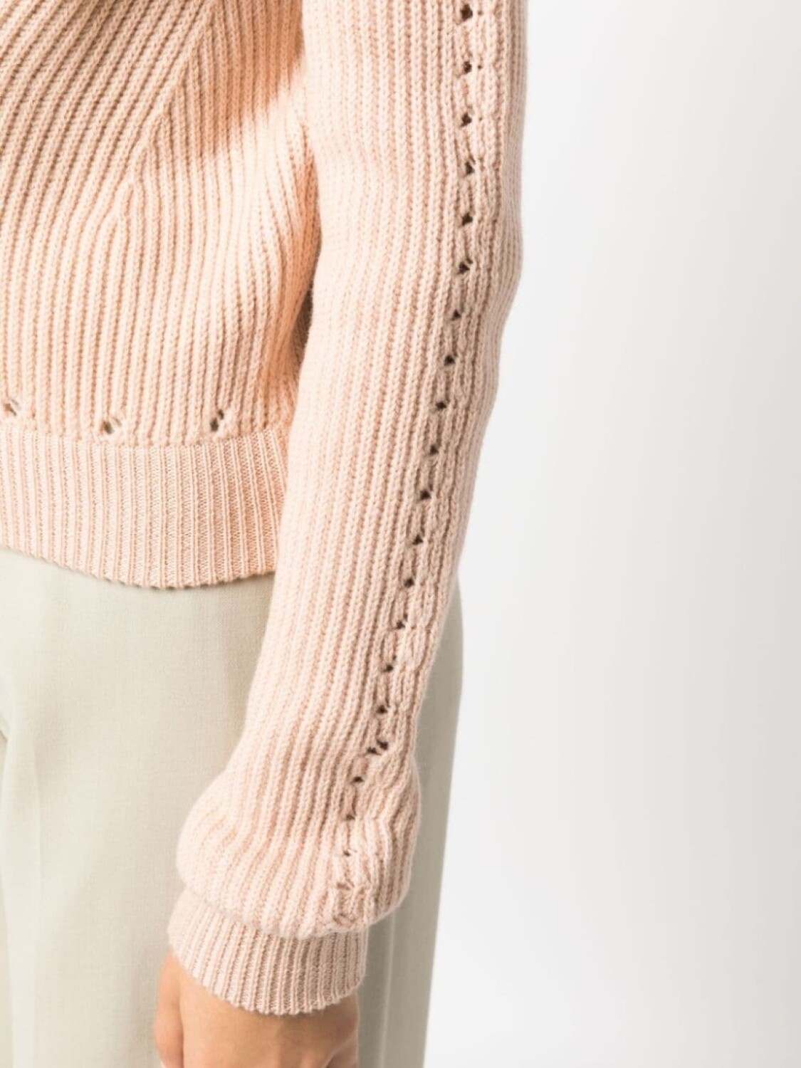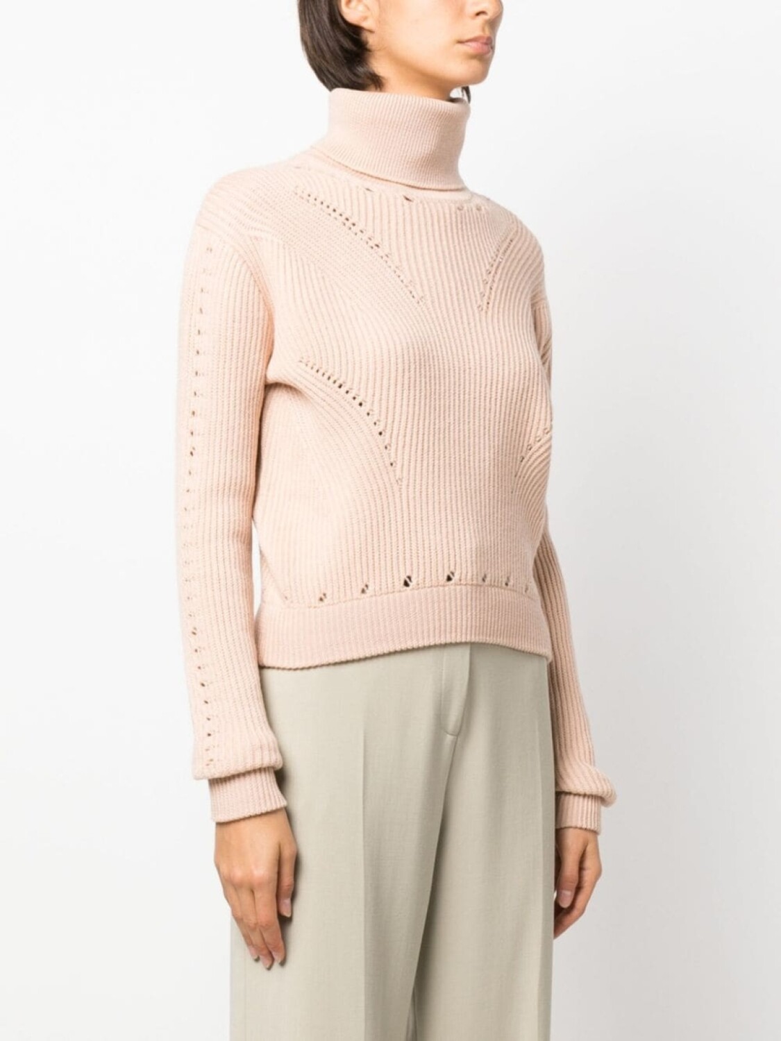 Светло-розовый, шерсть, трикотажный материал, трикотаж в рубчик, перфорация, подвеска с логотипом, высокий воротник, длинные рукава и прямой подол.