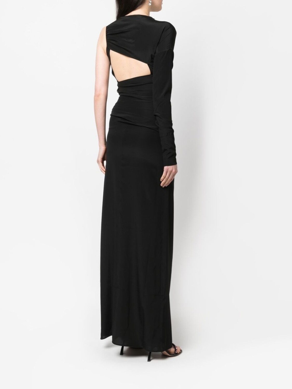 Черный, шелк, молния на плече, один рукав, вырезные детали, открытая спина, круглый вырез и длинная модель.
