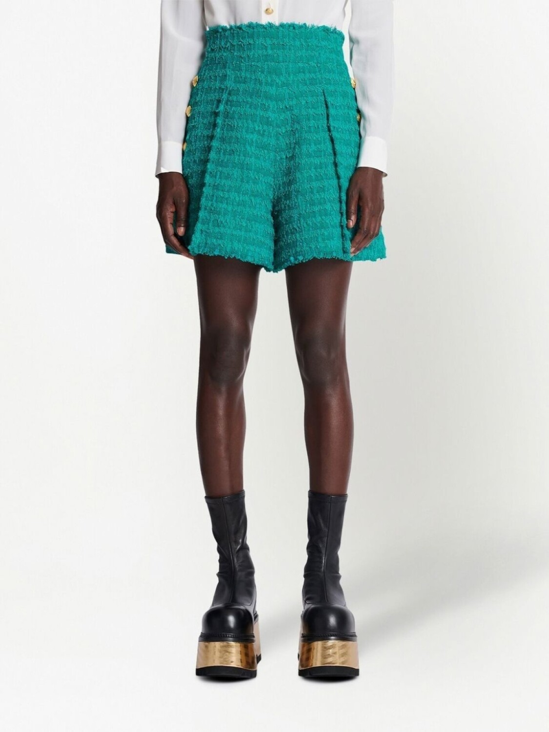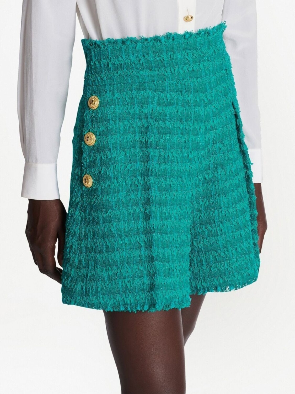 бирюзовый твидовая ткань складки декоративные пуговицы завышенная талия застежка на молнии сзади два прорезных кармана по бокам длина до бедер