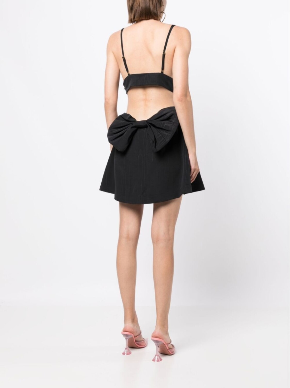 Черный, глубокий V-образный вырез, вырезные детали, крупный бант, открытая спина и длина до бедер.