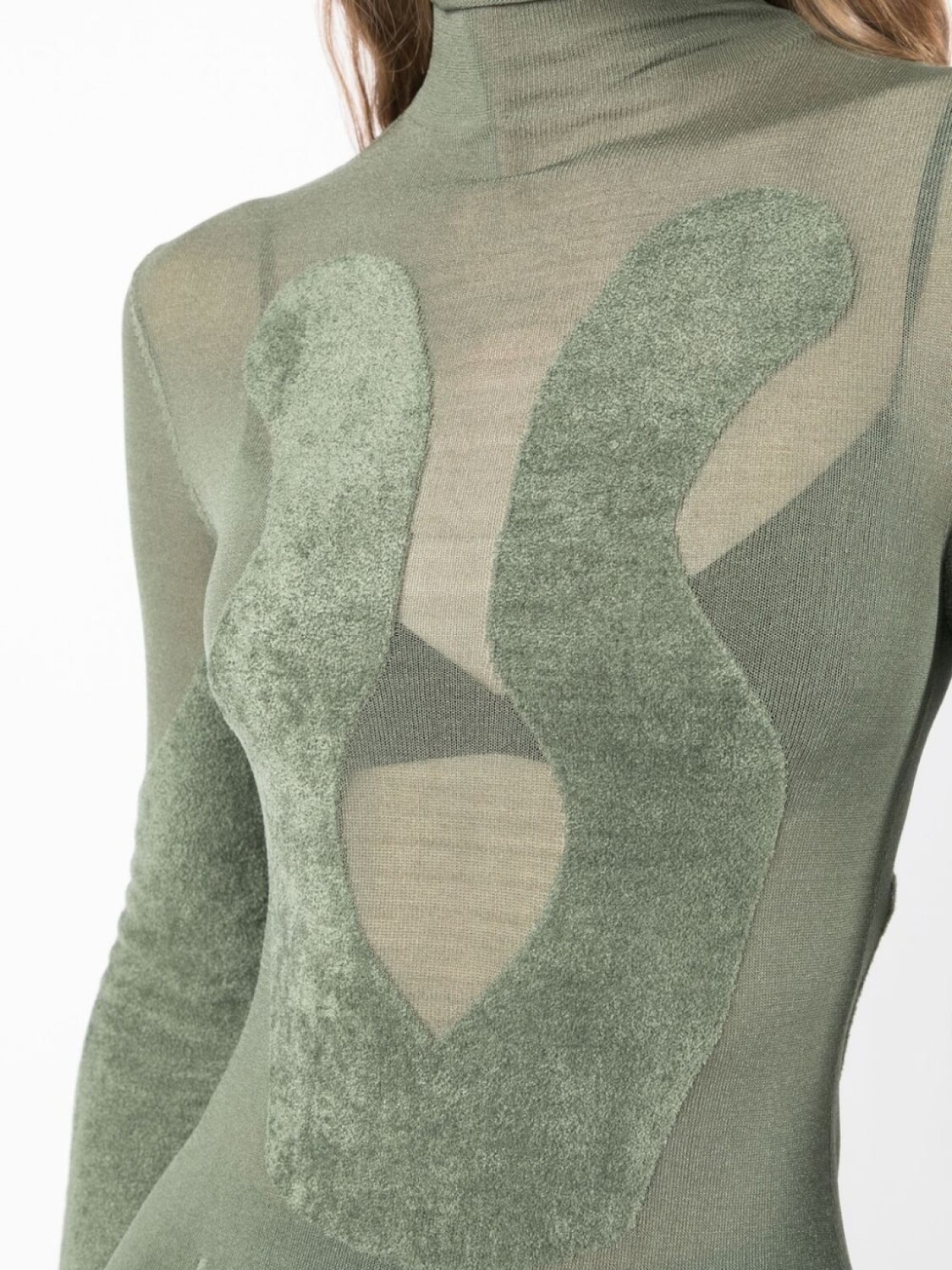 Светло-зеленый, тонкая вязка, полупрозрачный дизайн, высокий воротник, длинные рукава и приталенный силуэт.