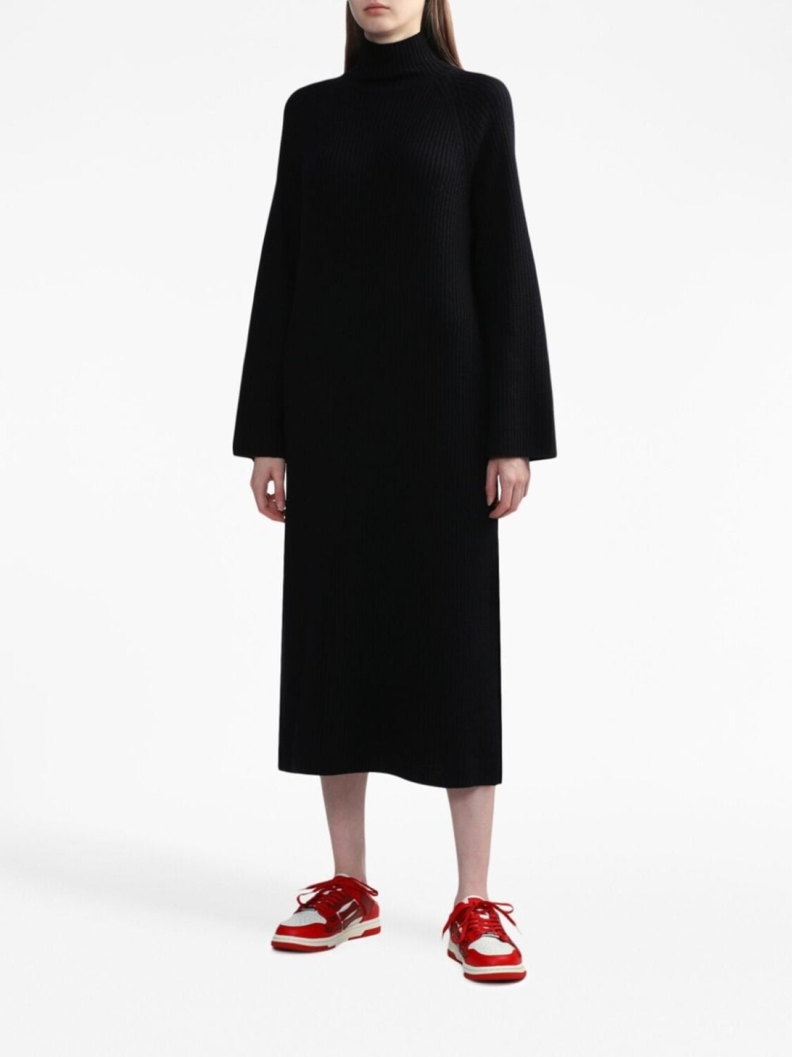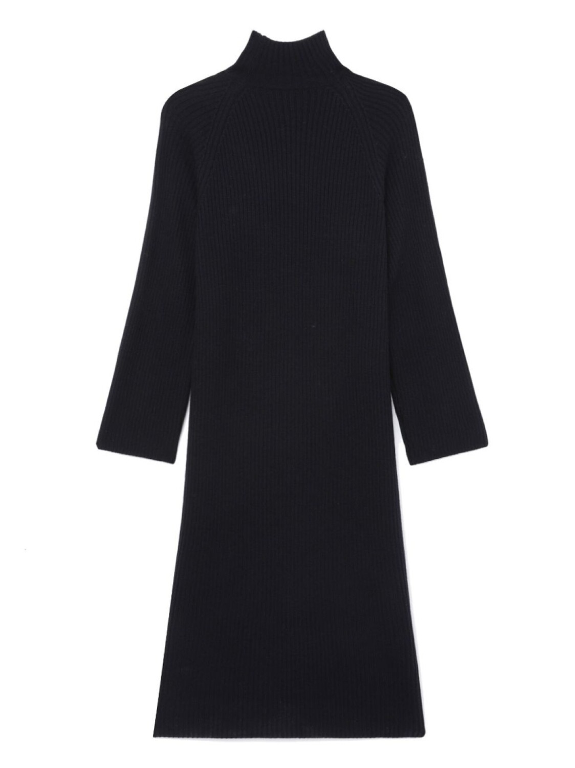 Темно-синий, необработанная шерсть, трикотаж в рубчик, высокий воротник, длинные широкие рукава, расклешенный крой, прямой подол и длина до середины икры.
