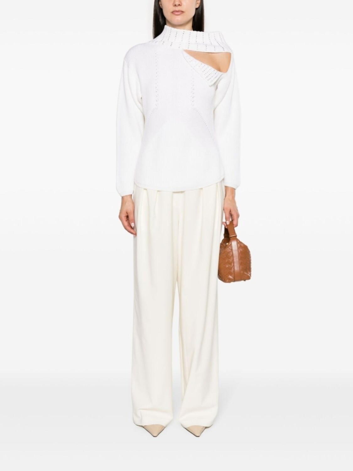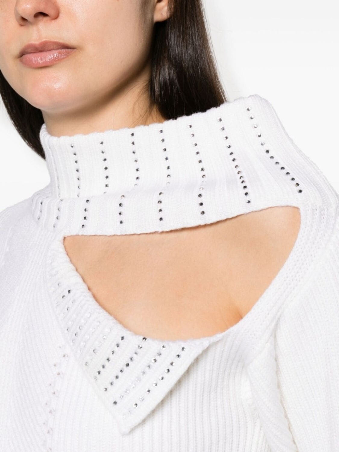 Белый, шерсть, крупная вязка, украшения из горного хрусталя, вырезные детали, логотип в тон, высокий воротник, длинные рукава, закругленный подол и модель без подкладки.