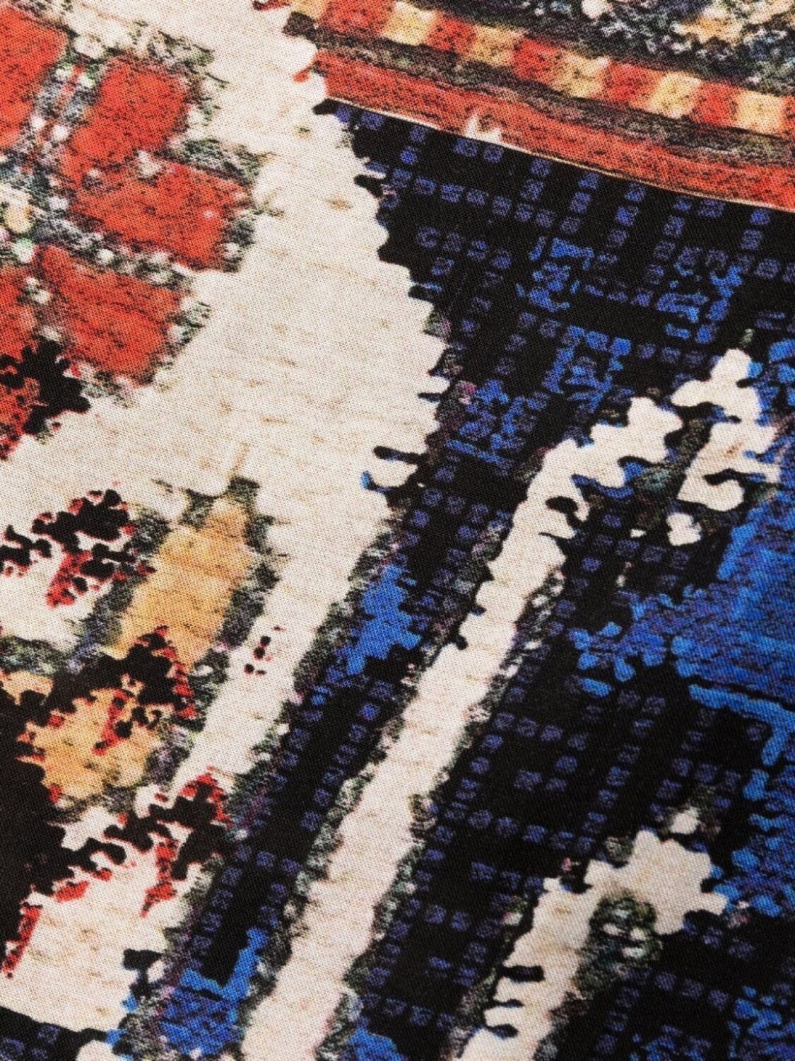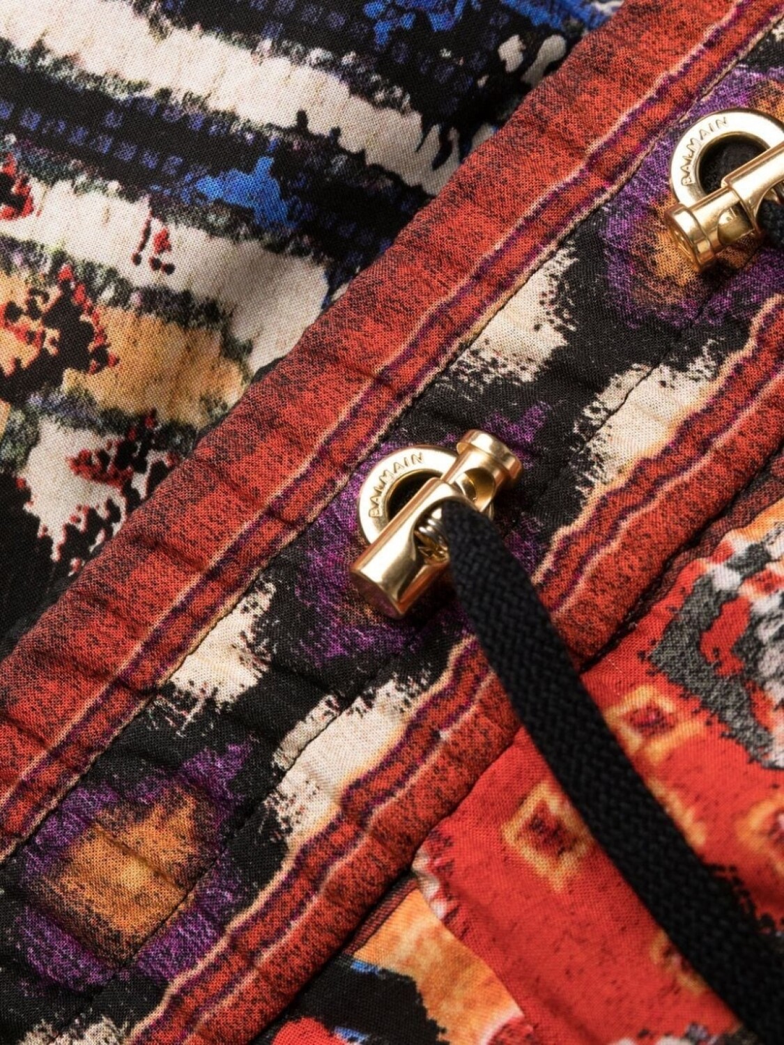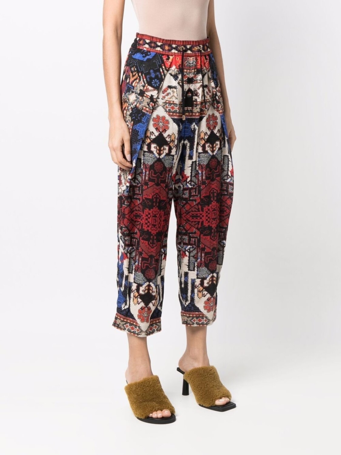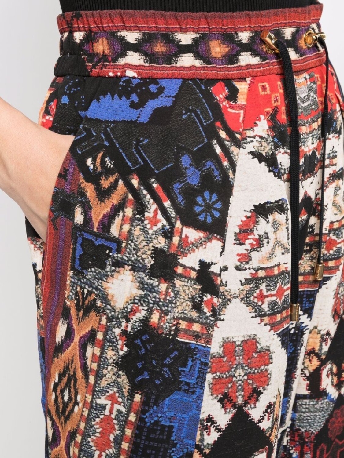 Завышенная талия, абстрактный принт, плиссировка, эластичный пояс на шнурке и укороченная длина.