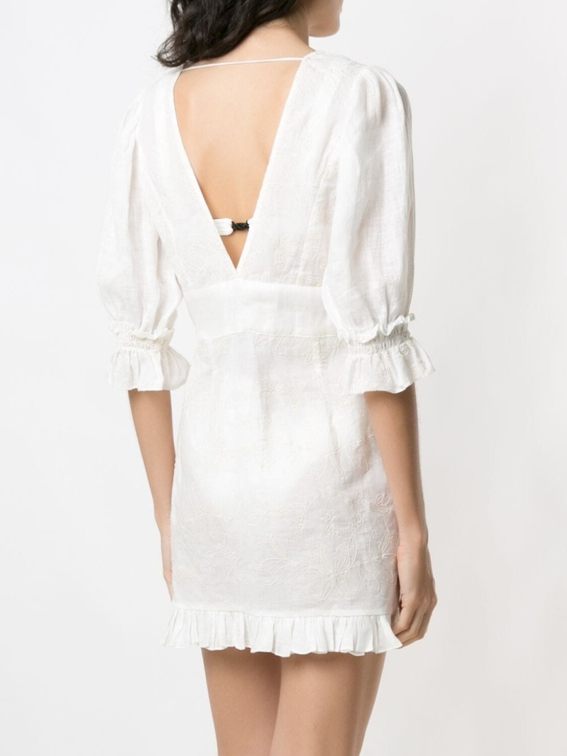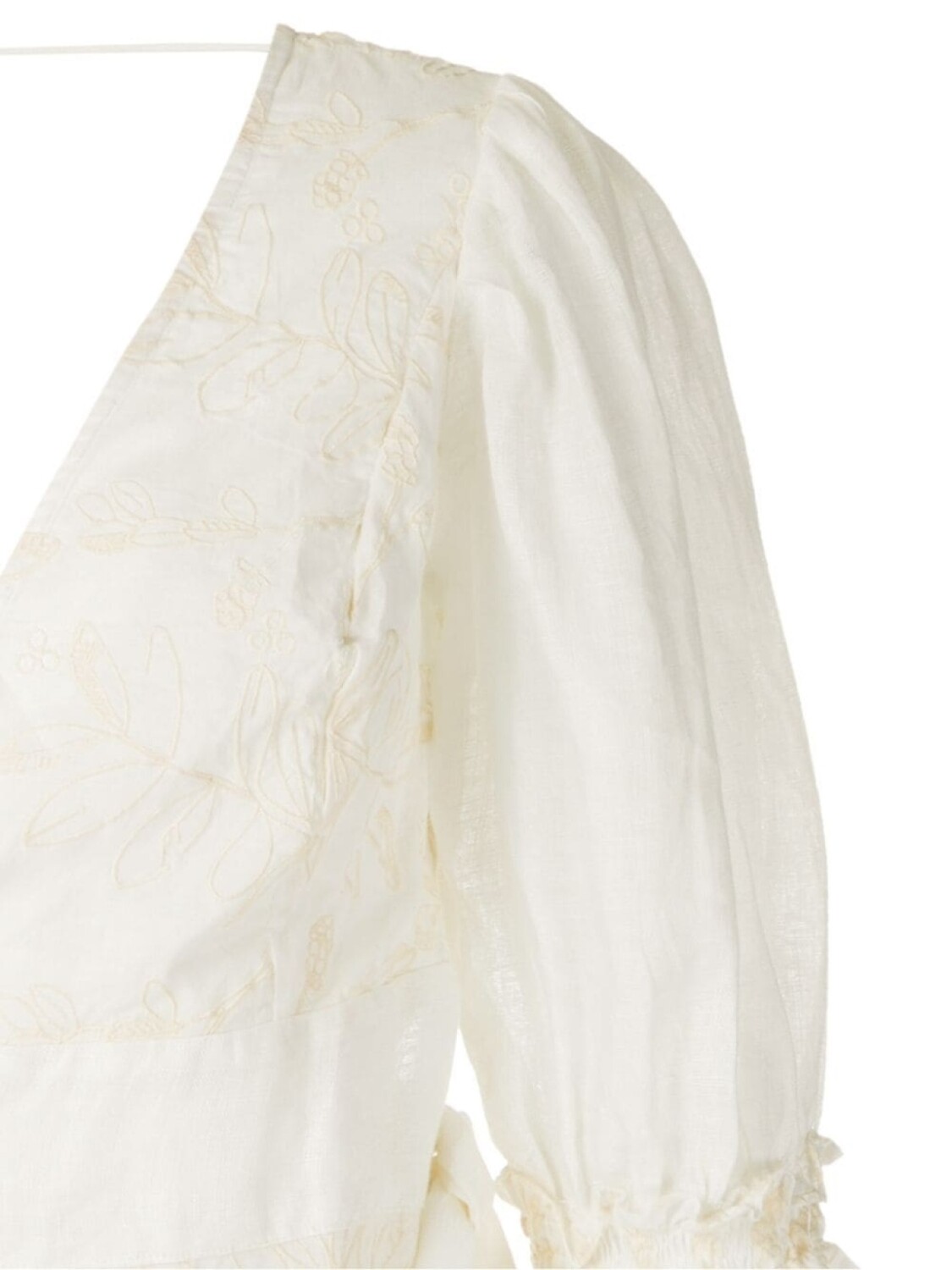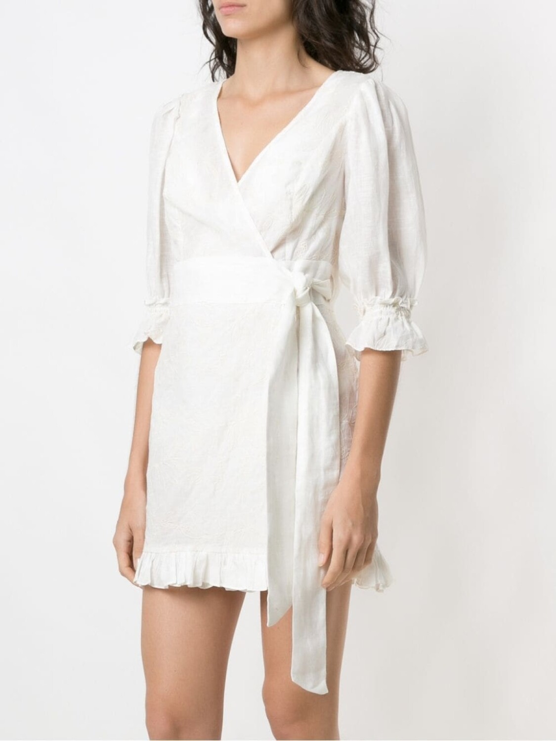 Платье Baron с вышивкой от Clube Bossa. V-образный вырез с запахом, боковая застежка на завязку, рукава по локоть, лиственный узор, короткая длина и узкий крой. Цвет: белый.