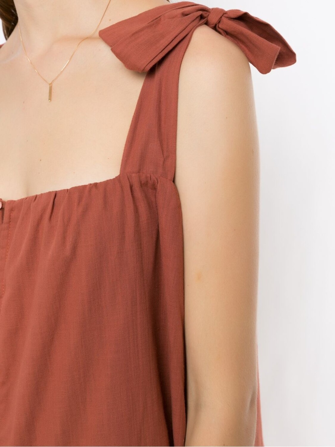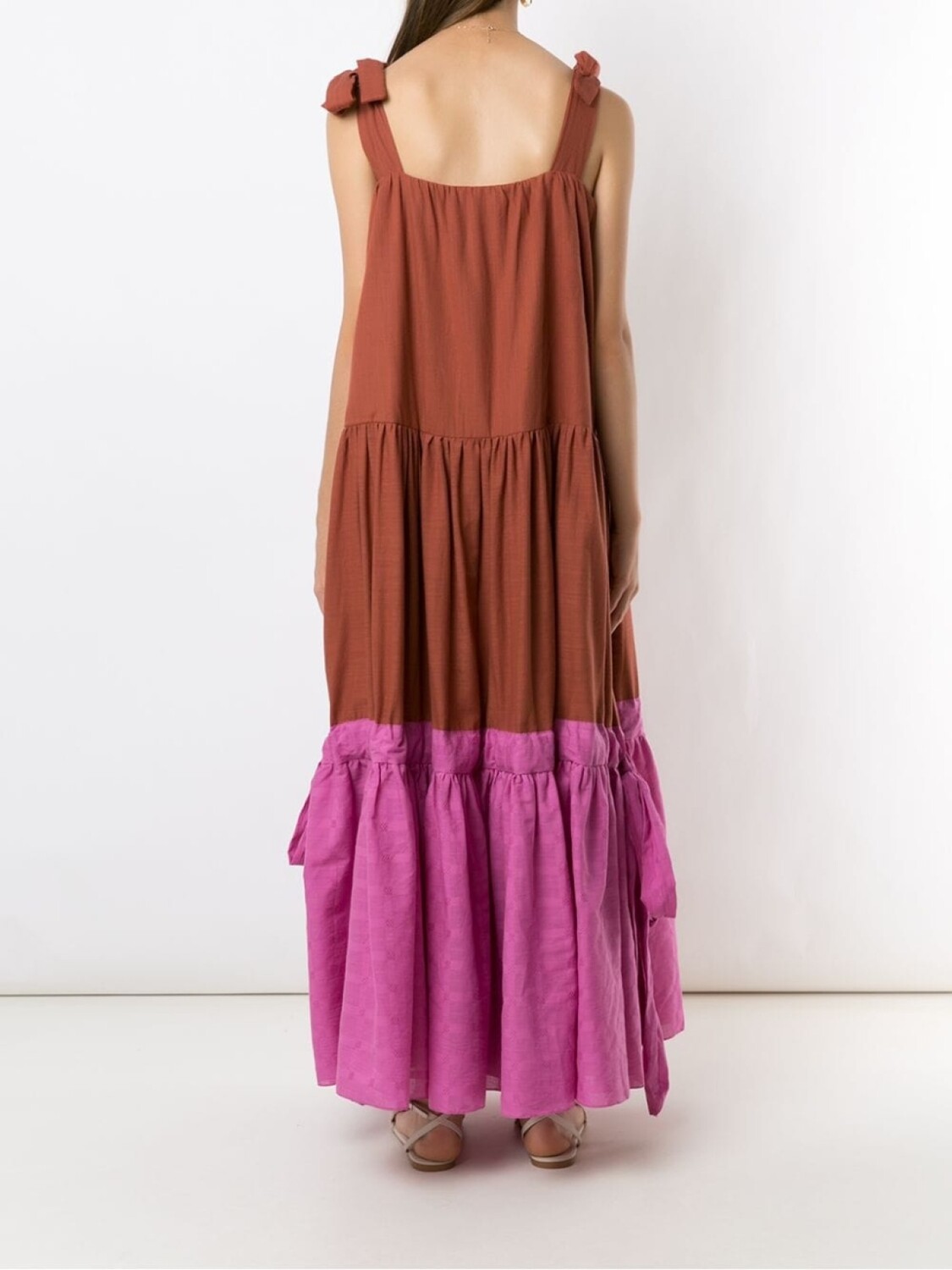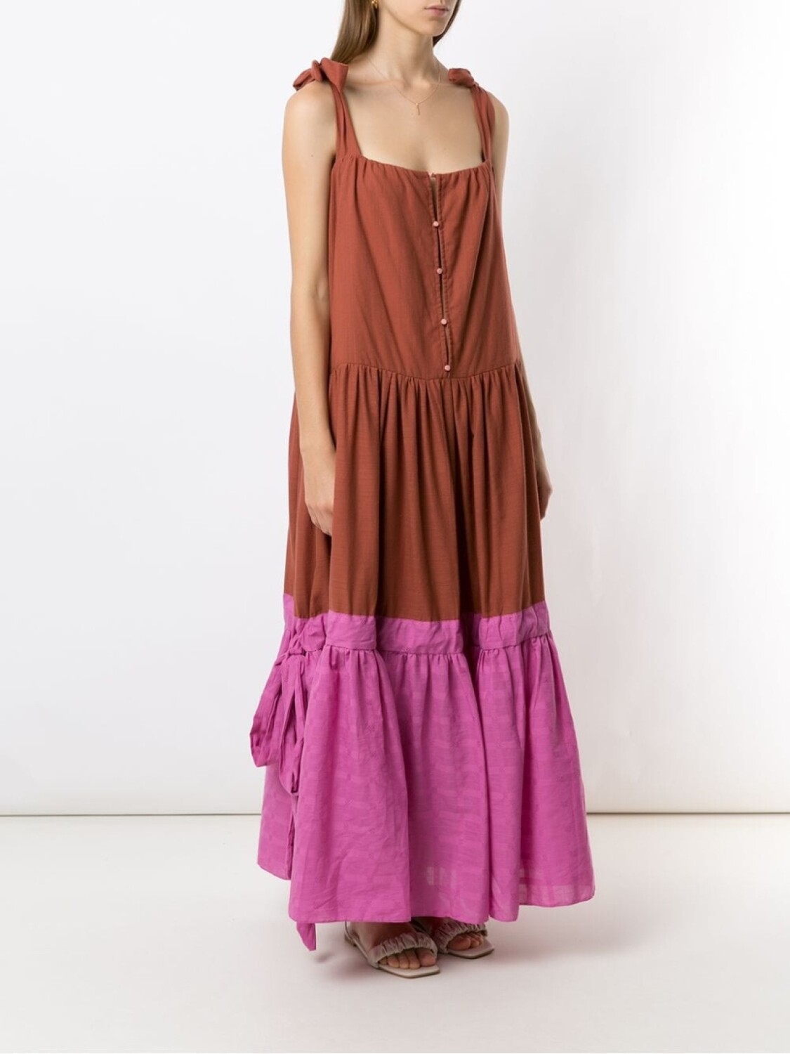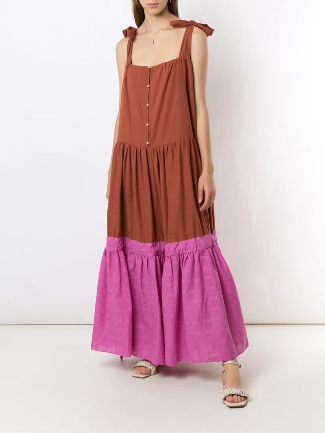 Многоярусная юбка, квадратный вырез, застежка на пуговицах спереди, завязки по бокам, без рукавов и длина миди.