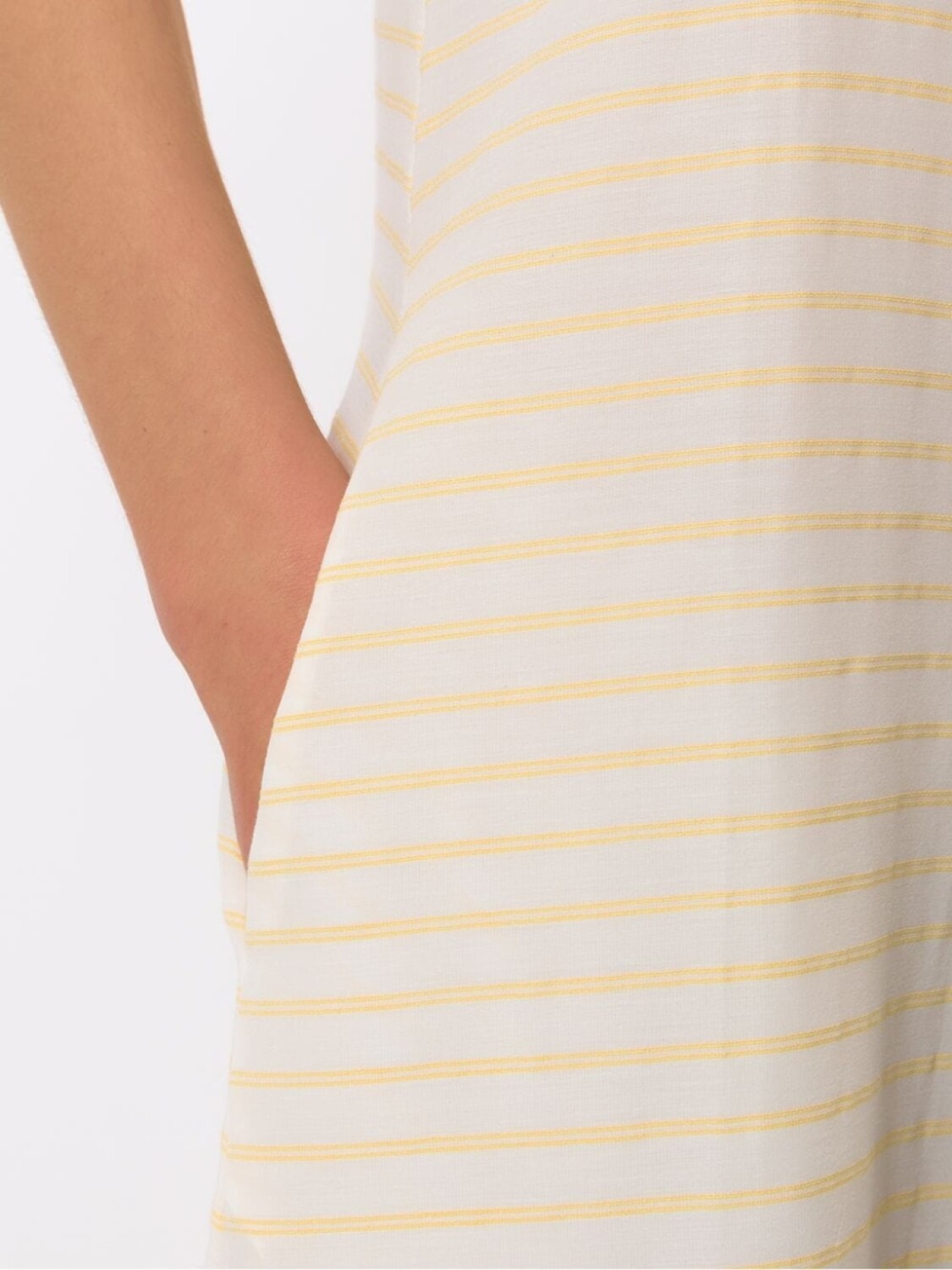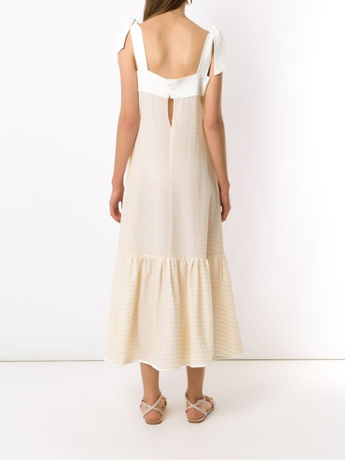 Принт в горизонтальную полоску, подол с оборками, регулируемые лямки, квадратный вырез, без рукавов и длина миди.