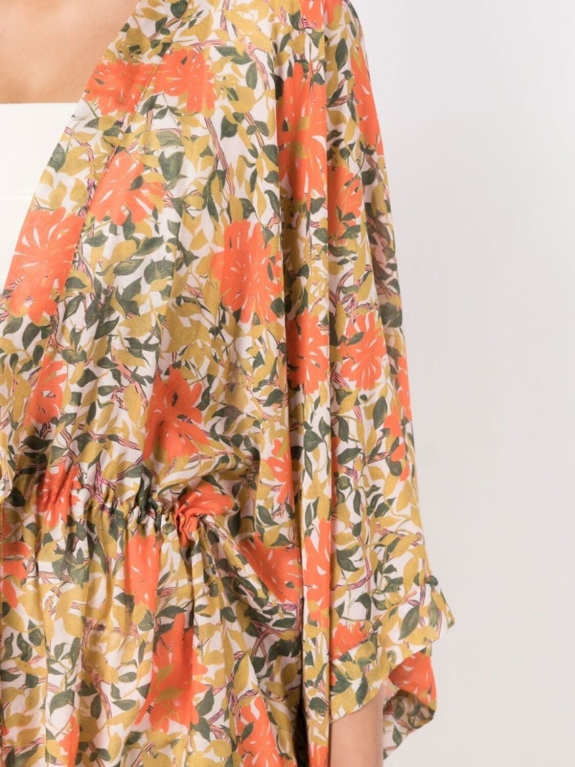 Разноцветный, смесовый шелк, сплошной цветочный принт, драпировка, V-образный вырез, потайная застежка спереди, длинные рукава и асимметричный подол.