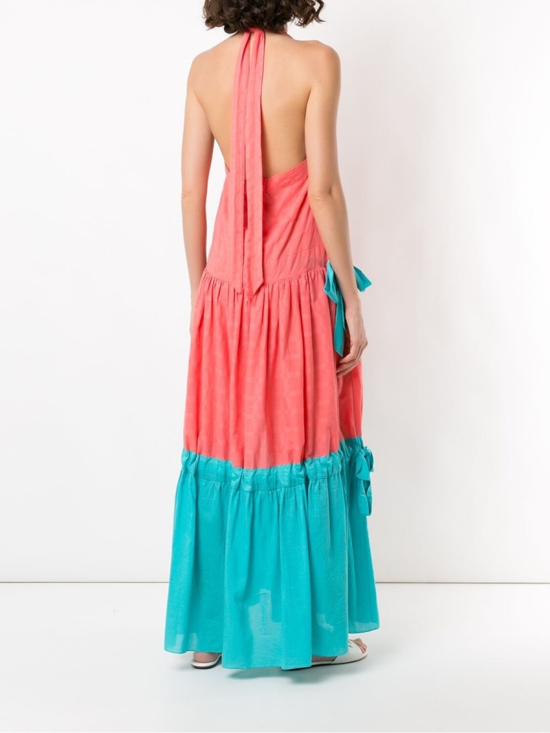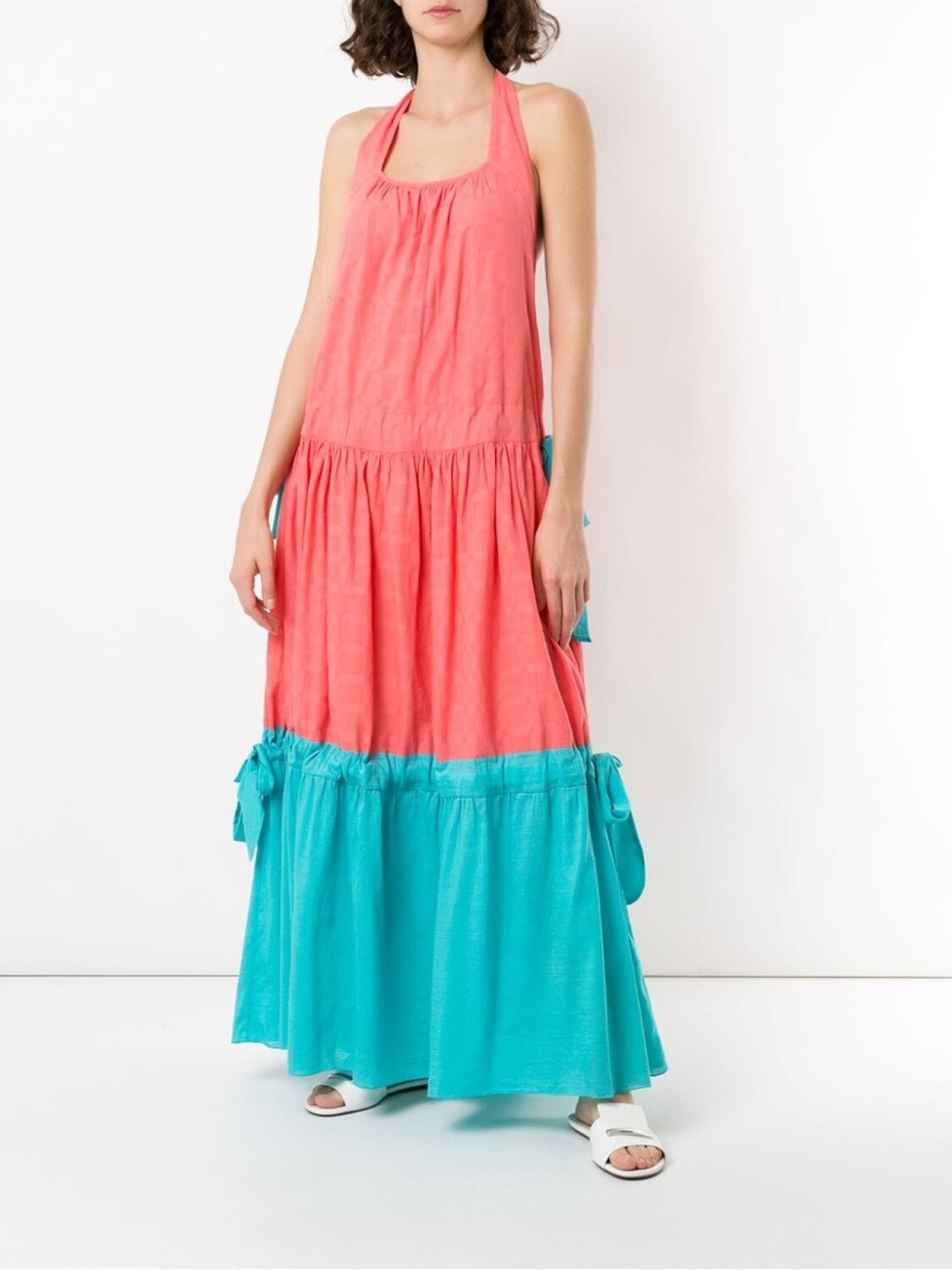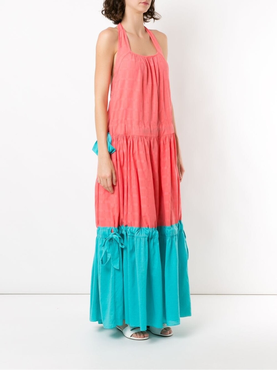 Платье макси Wocky от Clube Bossa. Вырез-петля халтер, застежка на завязке сзади, присборенные детали, удлиненная модель и расклешенный силуэт.