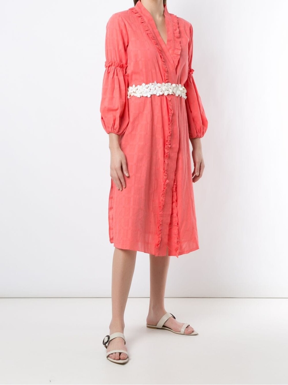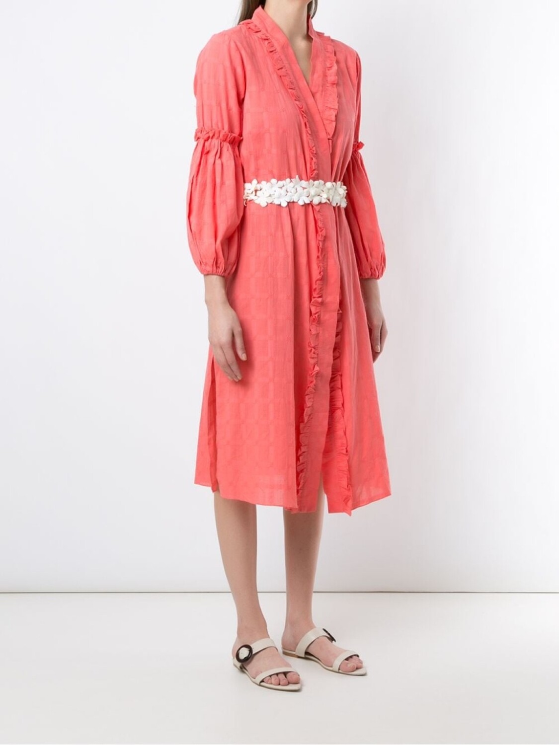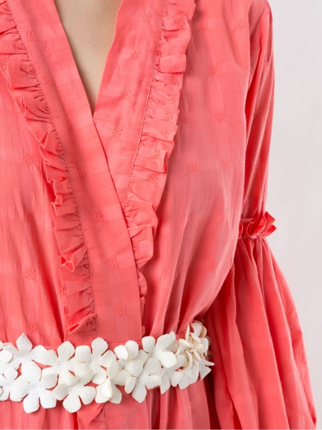 Платье миди Krista от Clube Bossa. V-образный вырез с запахом, длинные рукава, отделка с гофром, аппликация в форме цветов, талия на завязке и свободный крой. Цвет: розовый.