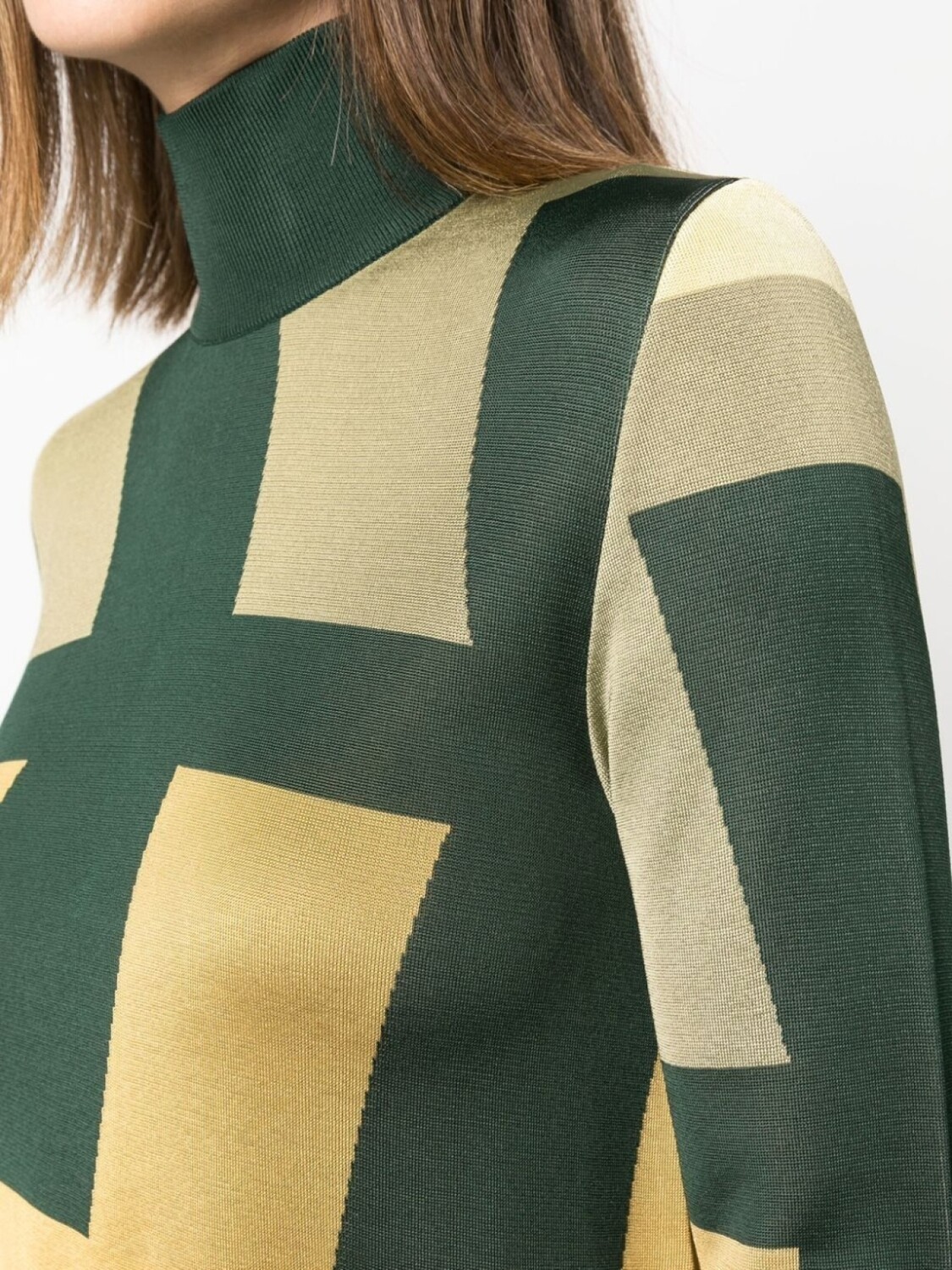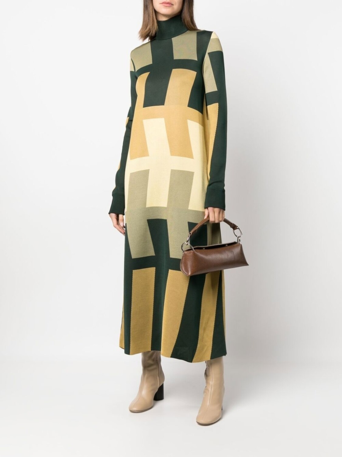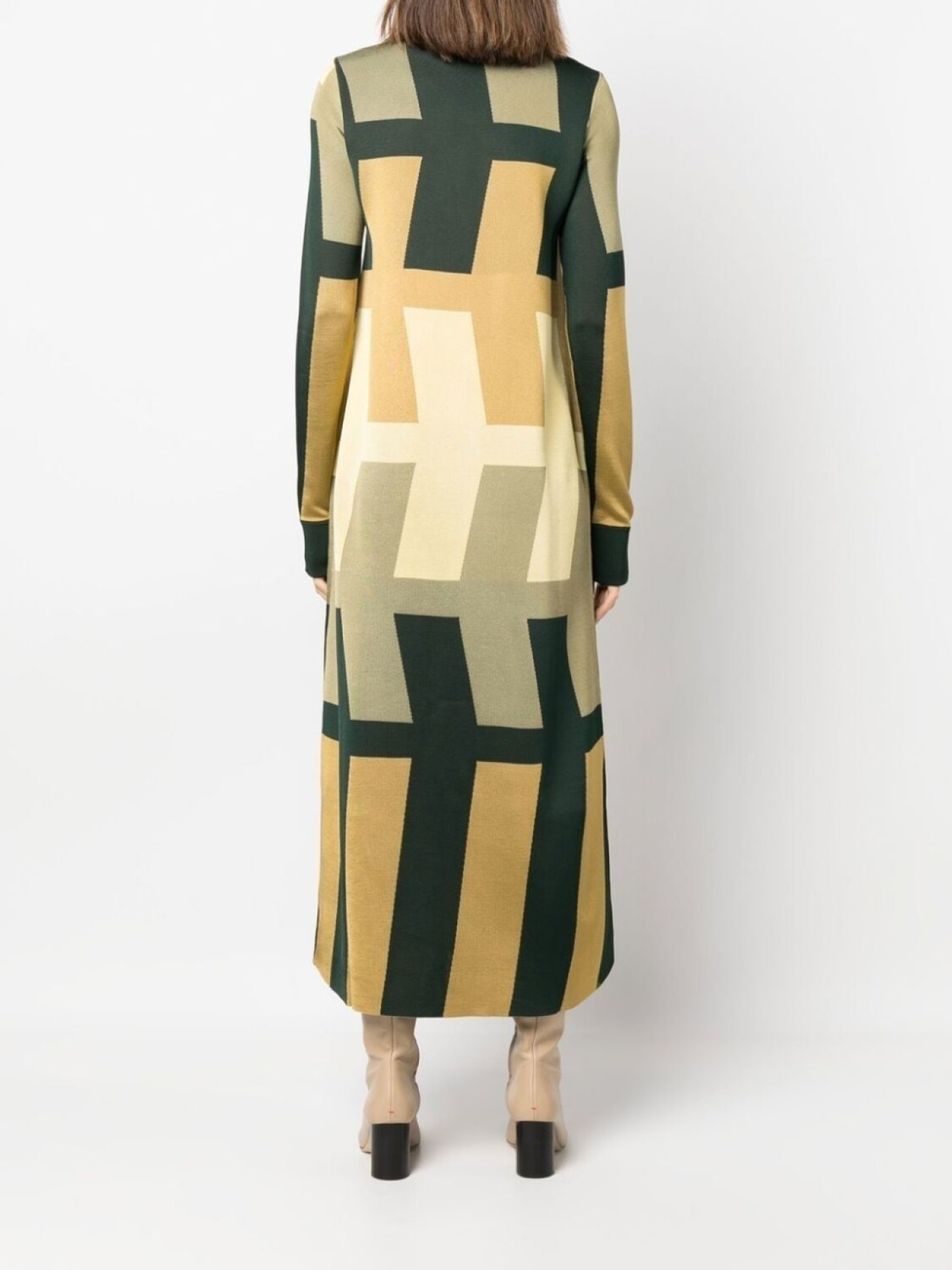 Горчично-желтый, изумрудно-зеленый, хаки, ткань джерси, высокий воротник, геометричный принт, длинные рукава и крой по косой.