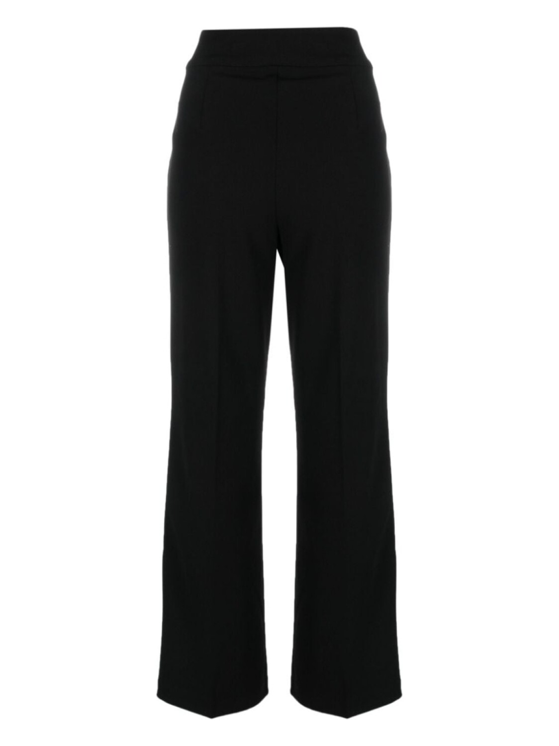 Черный, эластичный материал, потайная застежка спереди, завышенная талия, стрелки и укороченная длина.