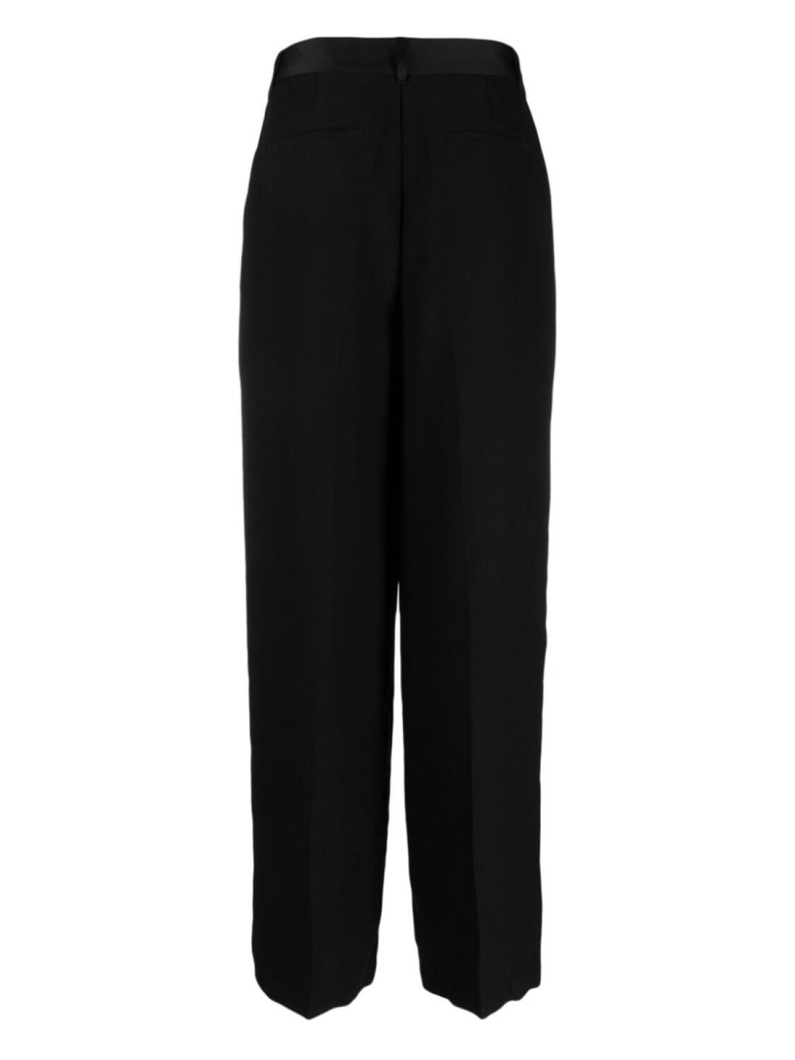 Черный, атласная отделка, складки, петли для ремня, потайная пуговичная застежка спереди, средняя посадка, широкий крой, два вшитых кармана по бокам и два кармана с листочкой сзади.