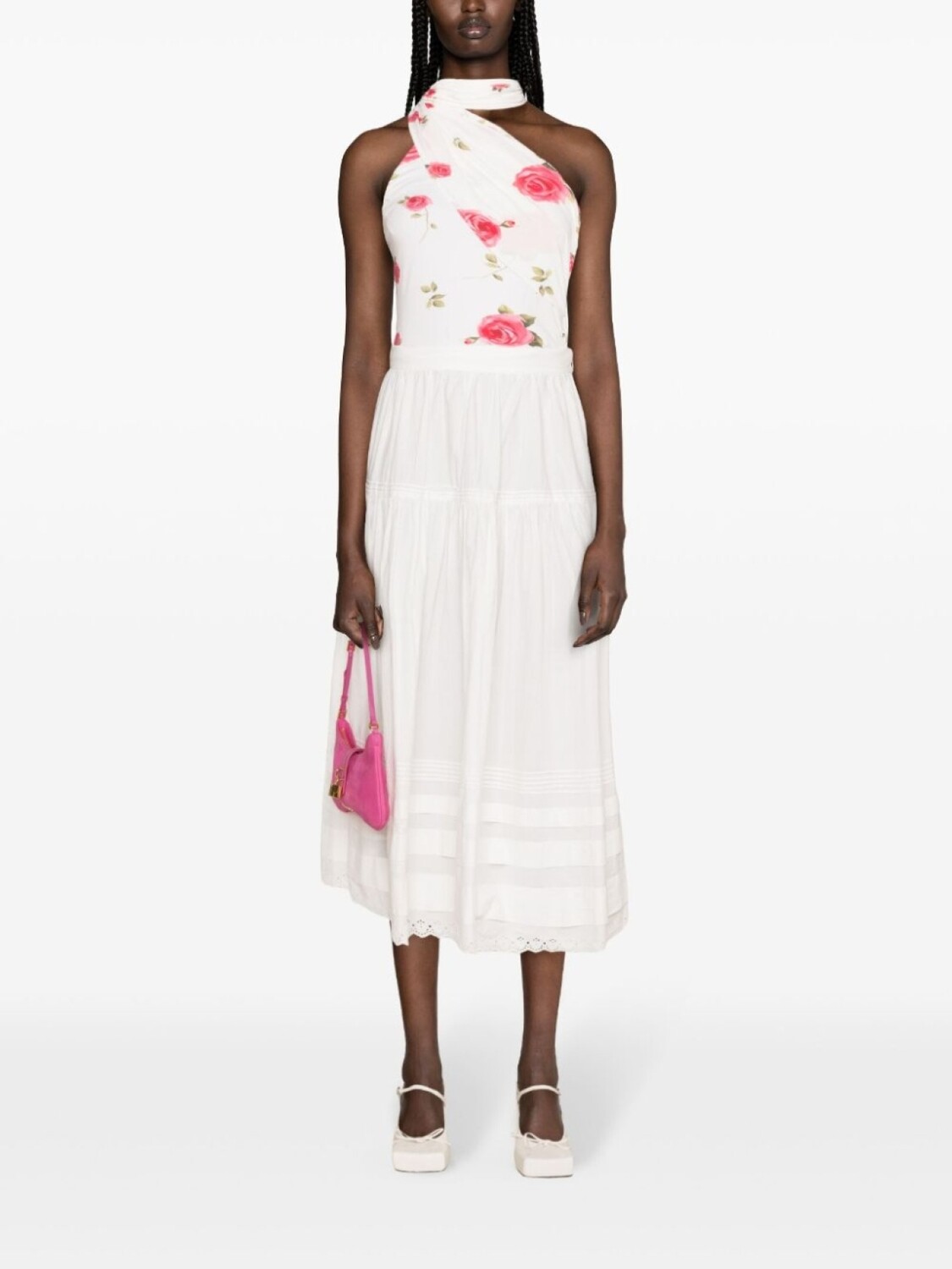 Белый, органический хлопок, поплин, складки, вытачки, А-образный силуэт, ярусная юбка, завышенная талия, потайная застежка на молнии сбоку, подол с фкстонами, длина миди, Этот товар как минимум на 50% состоит из органических материалов., Узнать больше о том, какие товары получают отметку «Ответственный выбор», можно здесь.