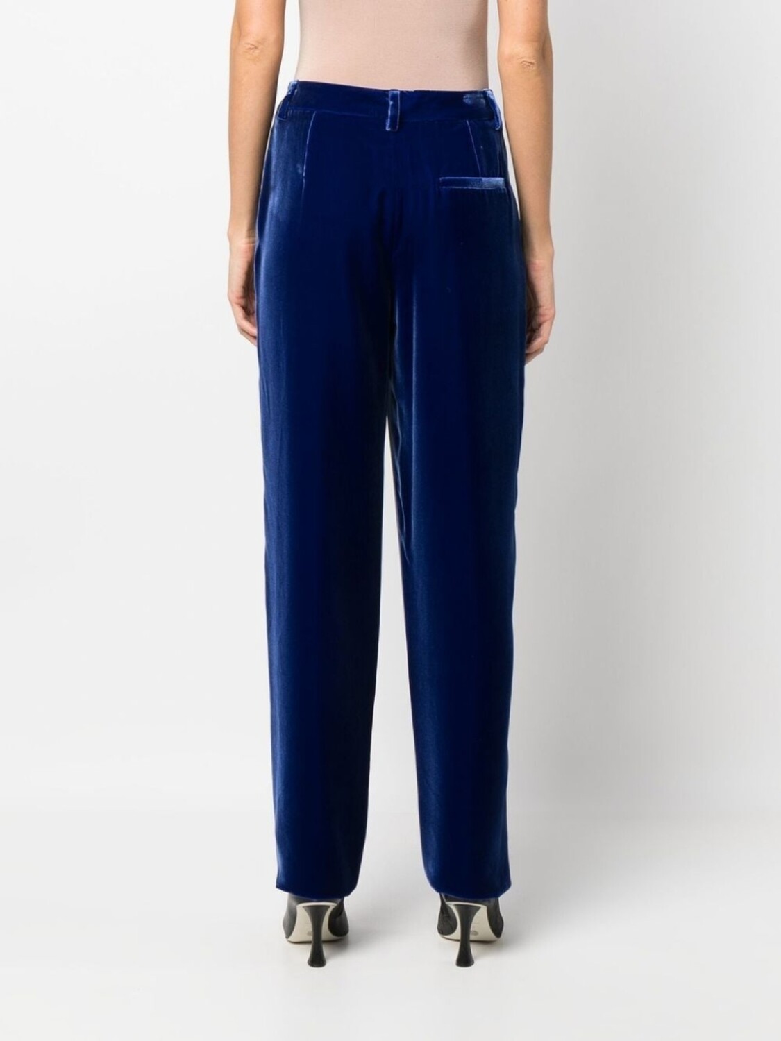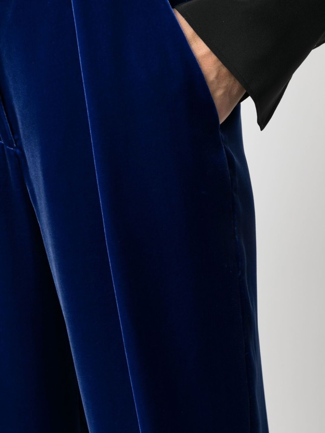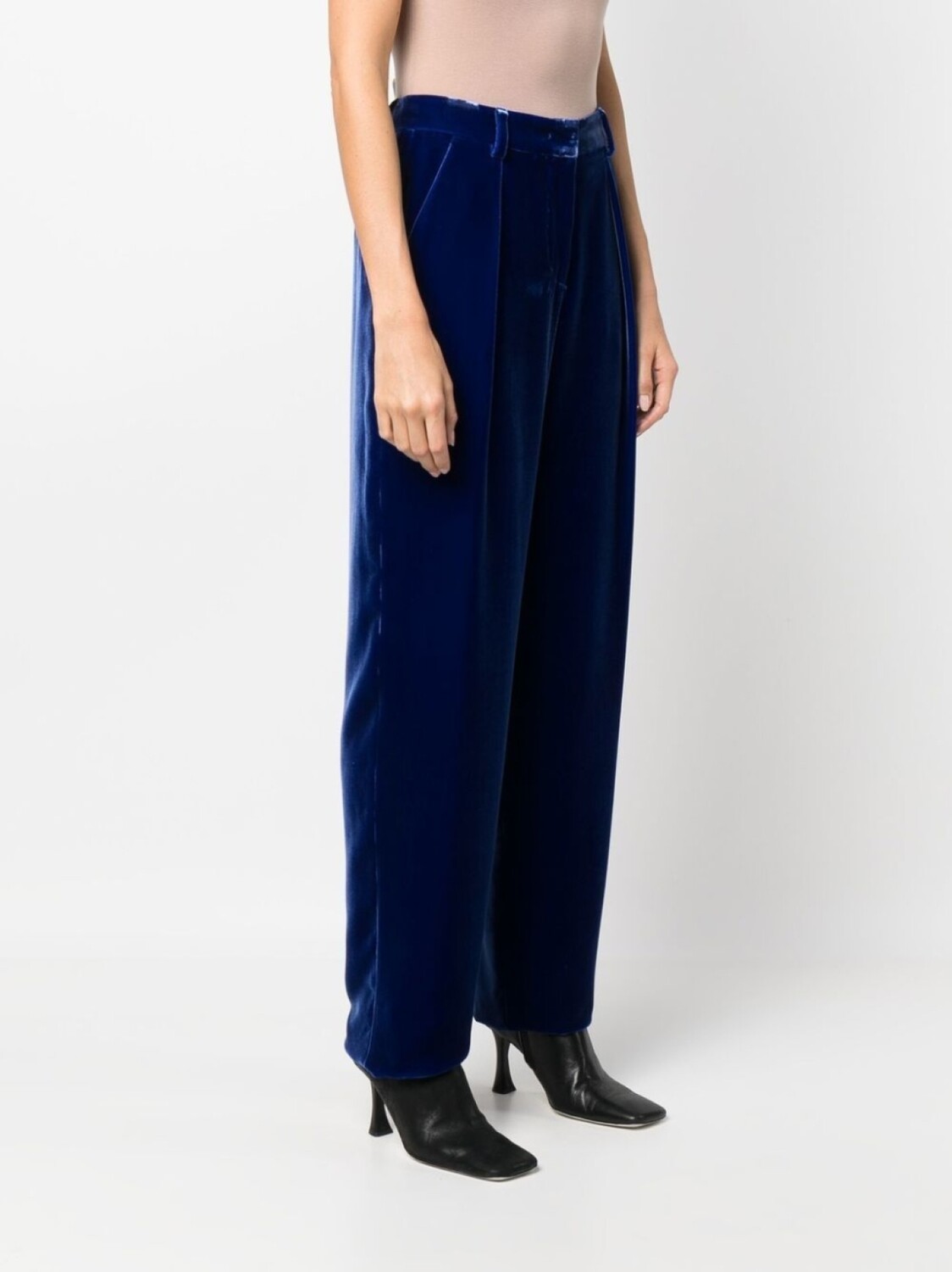 Синий, бархатистое покрытие, складки, средняя посадка, петли для ремня, потайная застежка на молнии и пуговицах, два прорезных кармана по бокам, задние карманы с листочкой и прямой крой.