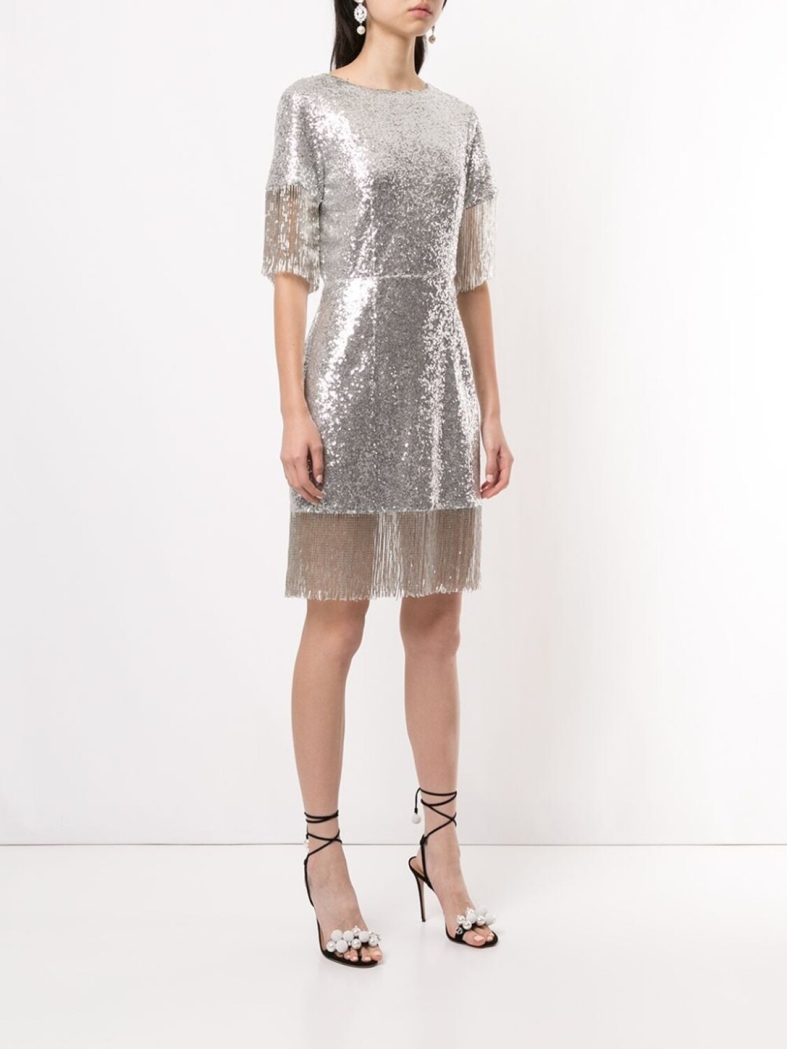 Круглый вырез, короткие рукава, тональная строчка, открытая спина, застежка на завязке сзади и отделка бисером. Цвет: серебристый.