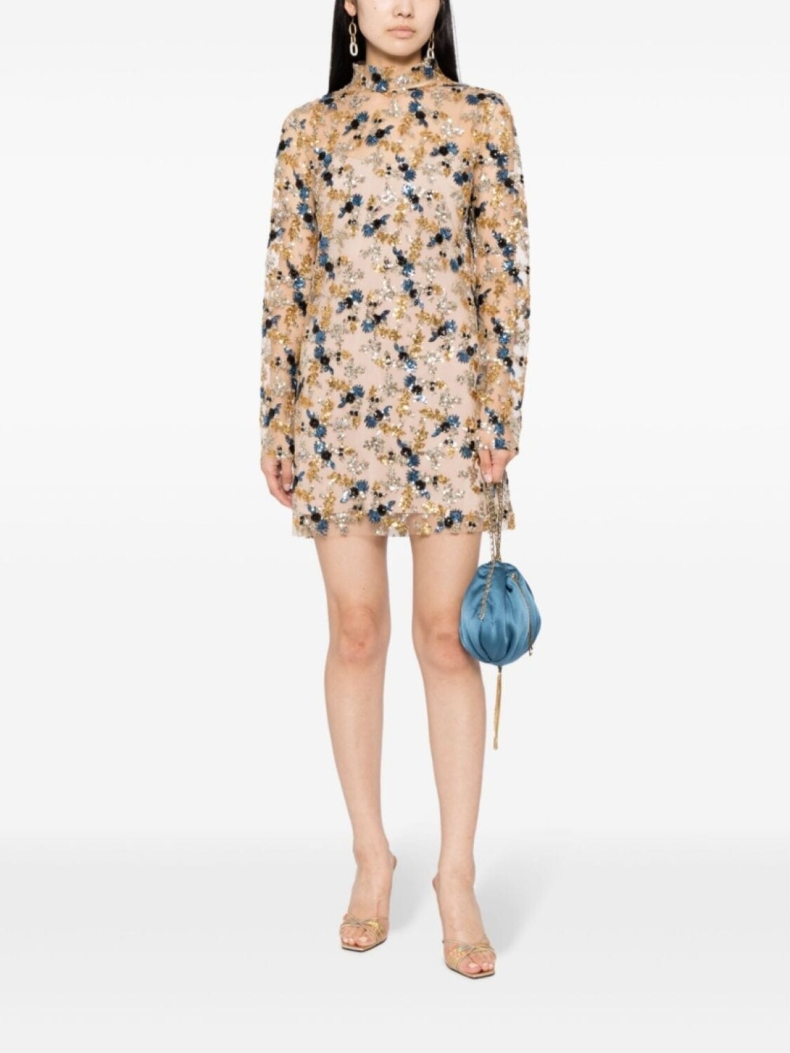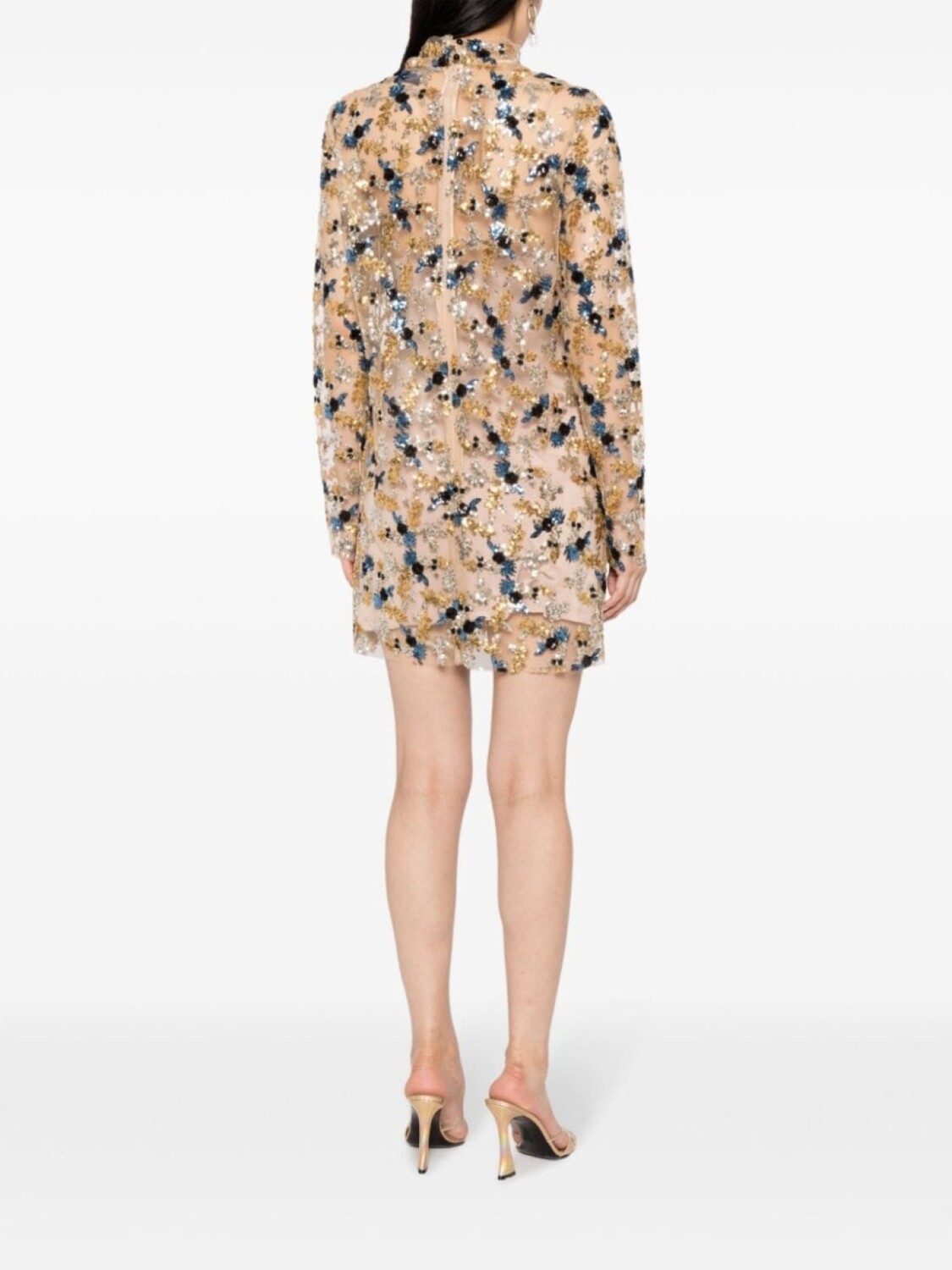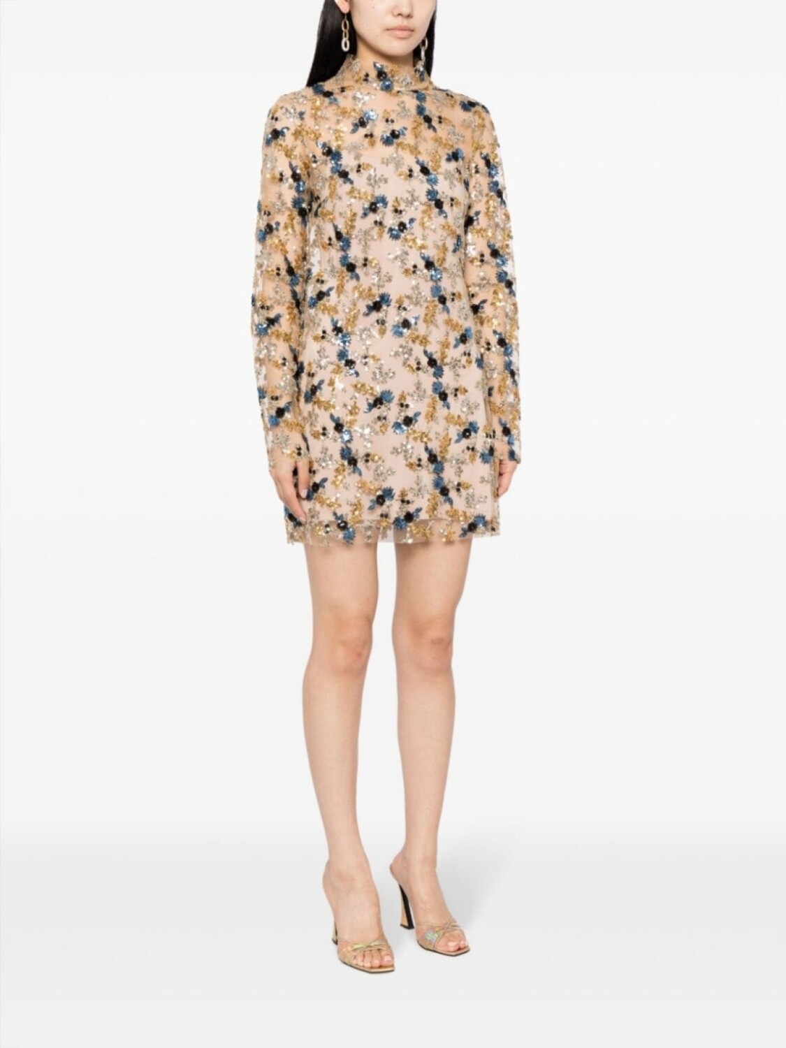Бежевый, разноцветный, полупрозрачный дизайн, сетчатый тюль, цветочная вышивка, украшение из пайеток, застежка на молнии сзади, высокий воротник, длинные рукава, прямой подол и длина до бедер.