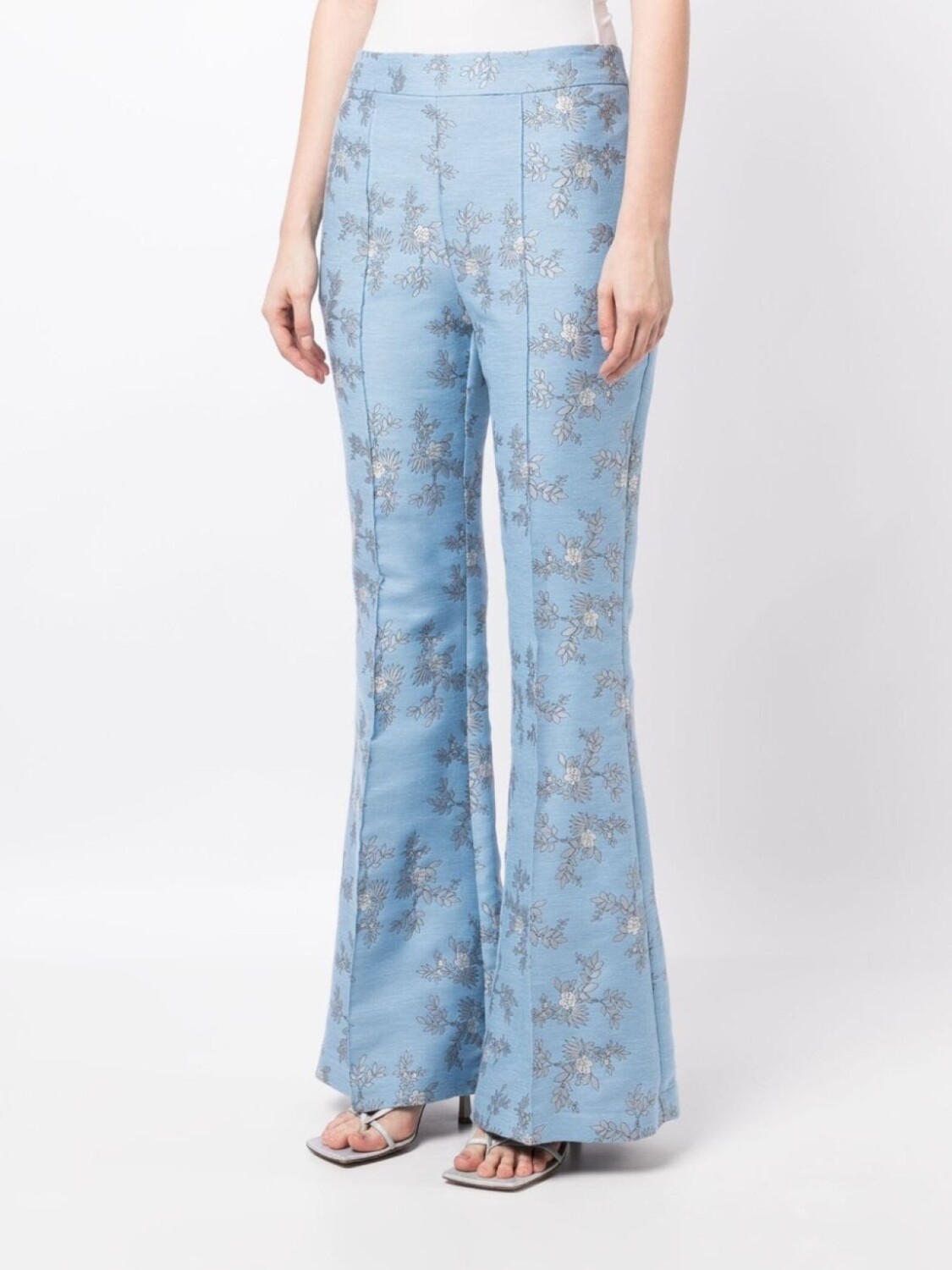 Голубой, пепельно-серый, цвет слоновой кости, жаккардовый материал с узором, сплошной цветочный принт, вытачки, завышенная талия, расклешенный крой, потайная застежка на молнии сзади, два вшитых кармана по бокам, прямой подол и модель без подкладки.