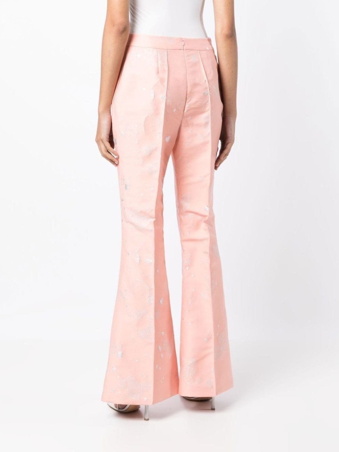 Розовый, серебристый, смесовый хлопок, завышенная талия, жаккардовая модель, швы, застежка на молнии сзади, расклешенный крой и два прорезных кармана по бокам.