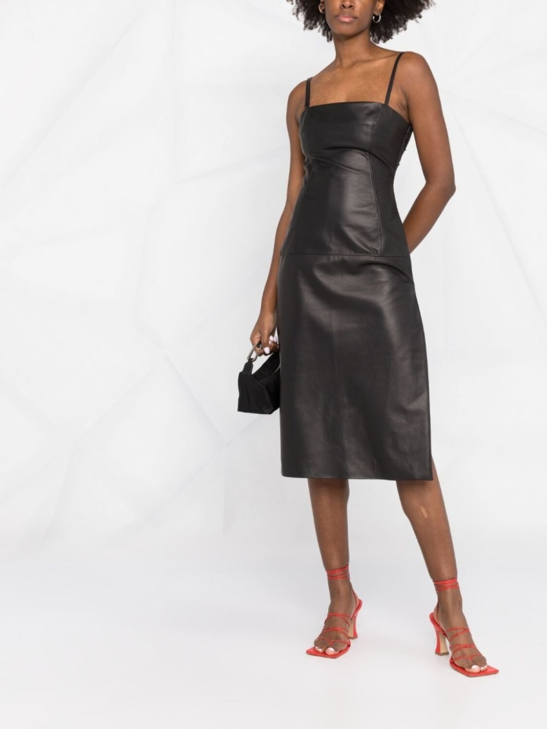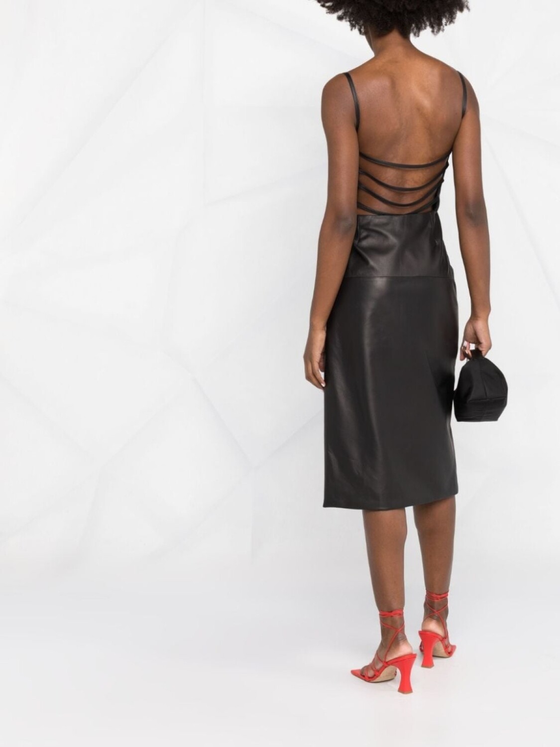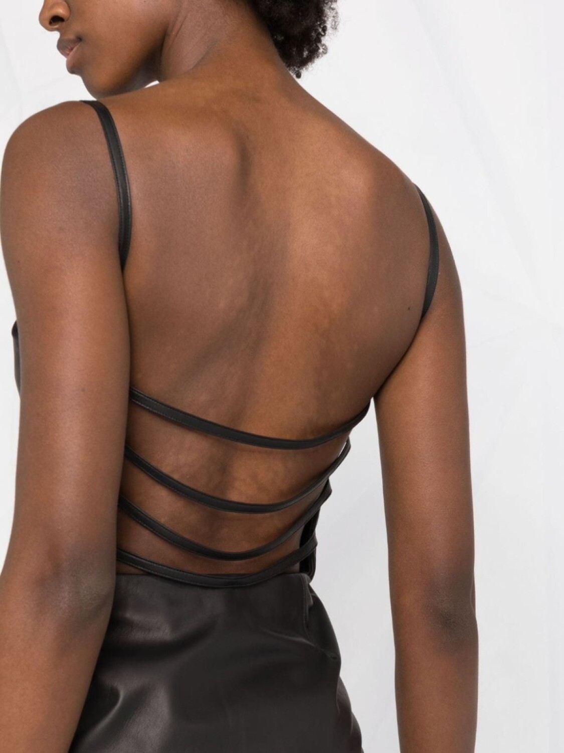Ремешки, открытая спина, глянцевая фактура, квадратный вырез и тонкие бретели. Цвет: черный.