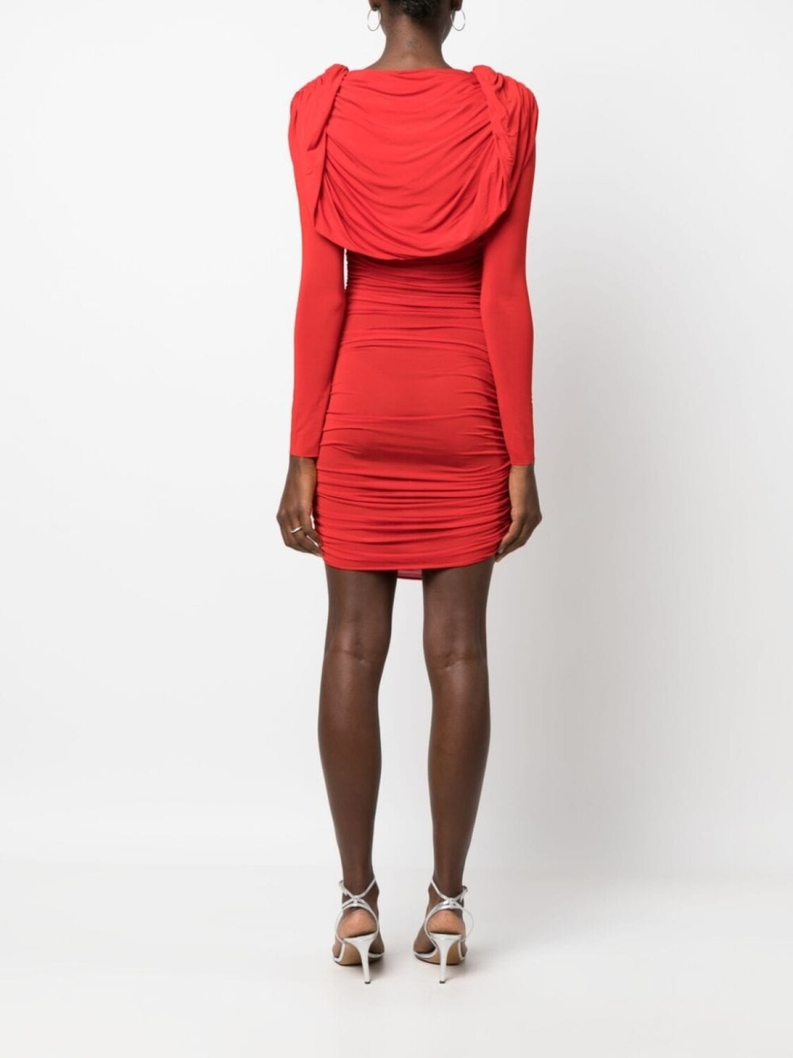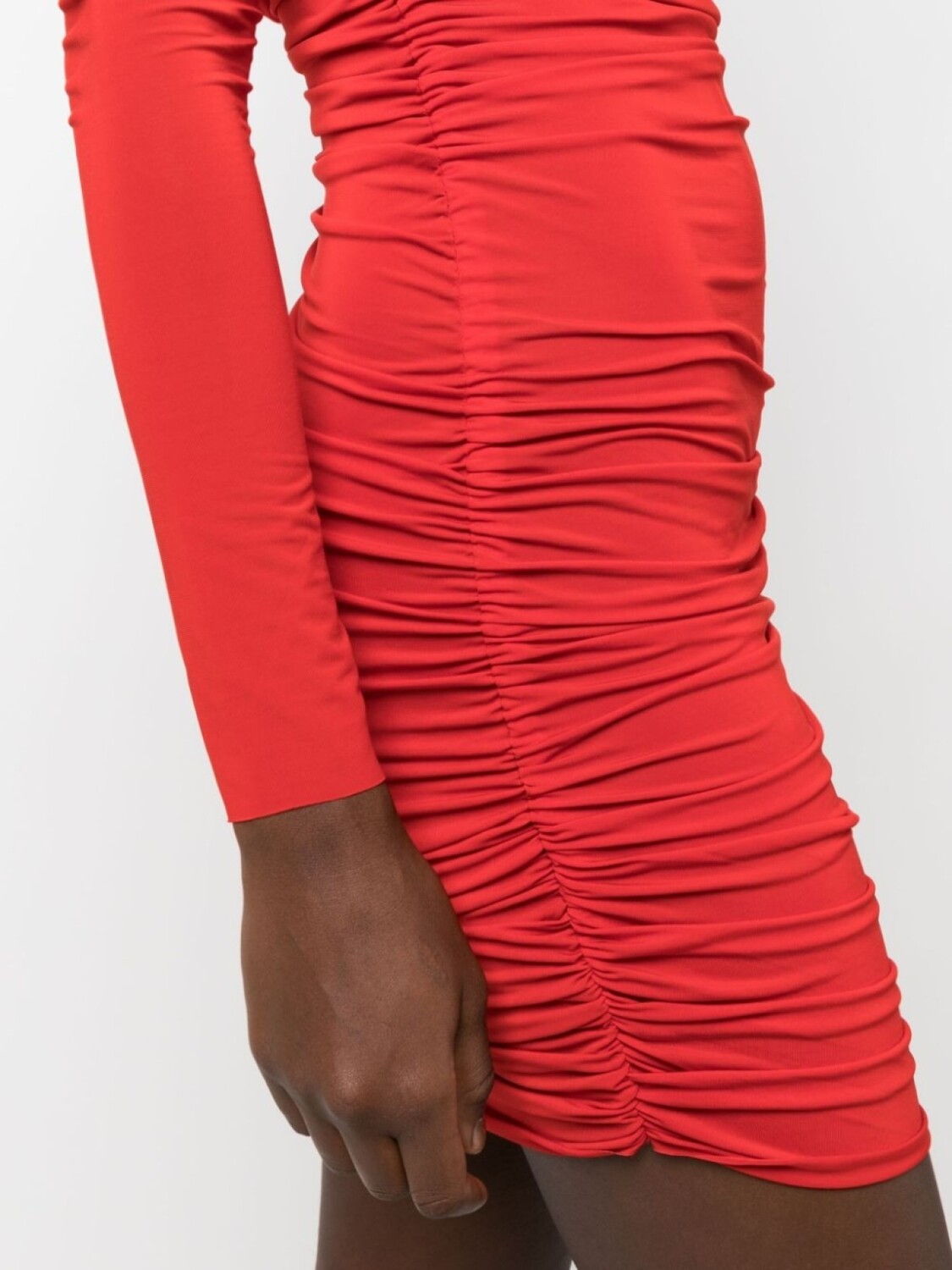 Ярко-красный, эластичный материал, облегающий крой, драпировка, детали с оборками, воротник-хомут, длинные рукава и длина до бедер.