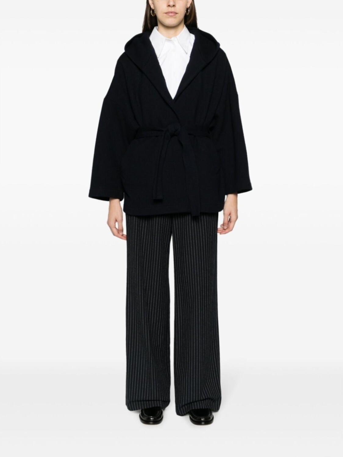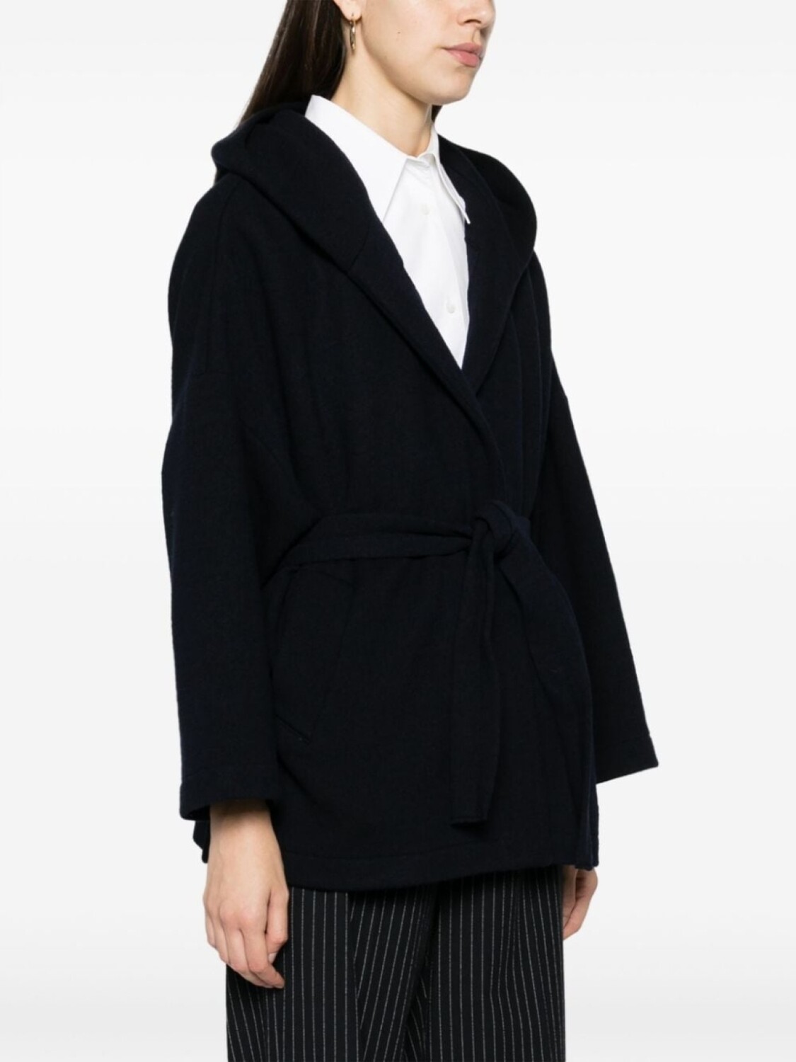 Темно-синий, необработанная шерсть, объемный капюшон, длинные рукава, кулиска на талии и прямой подол.