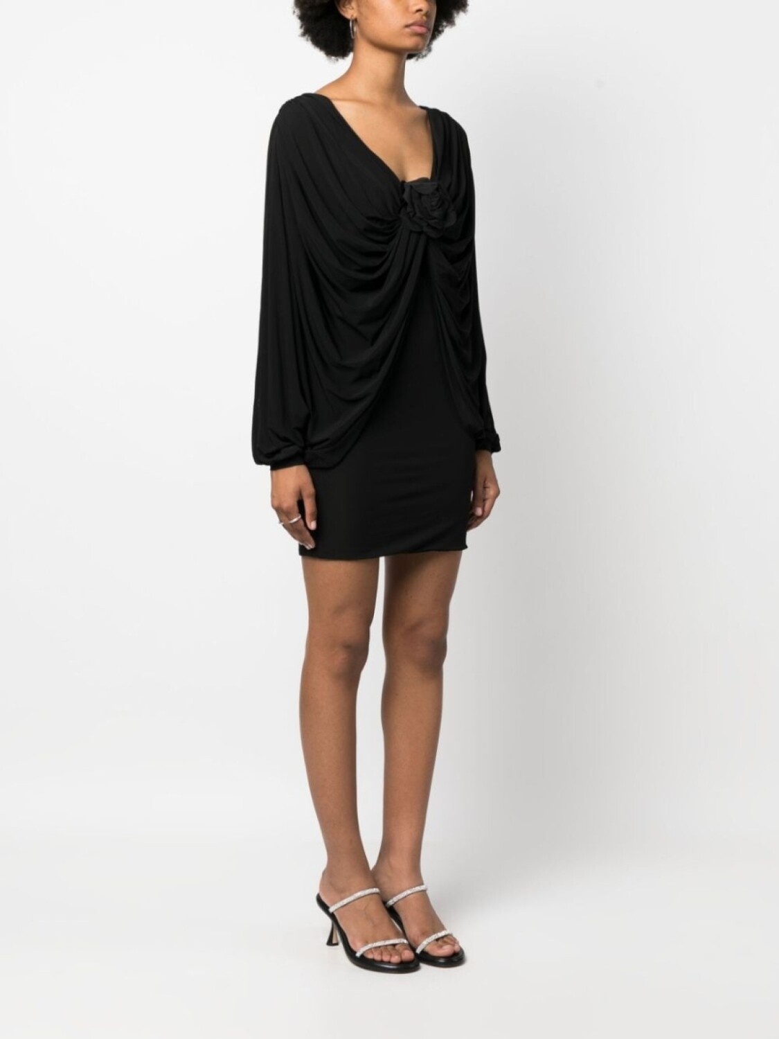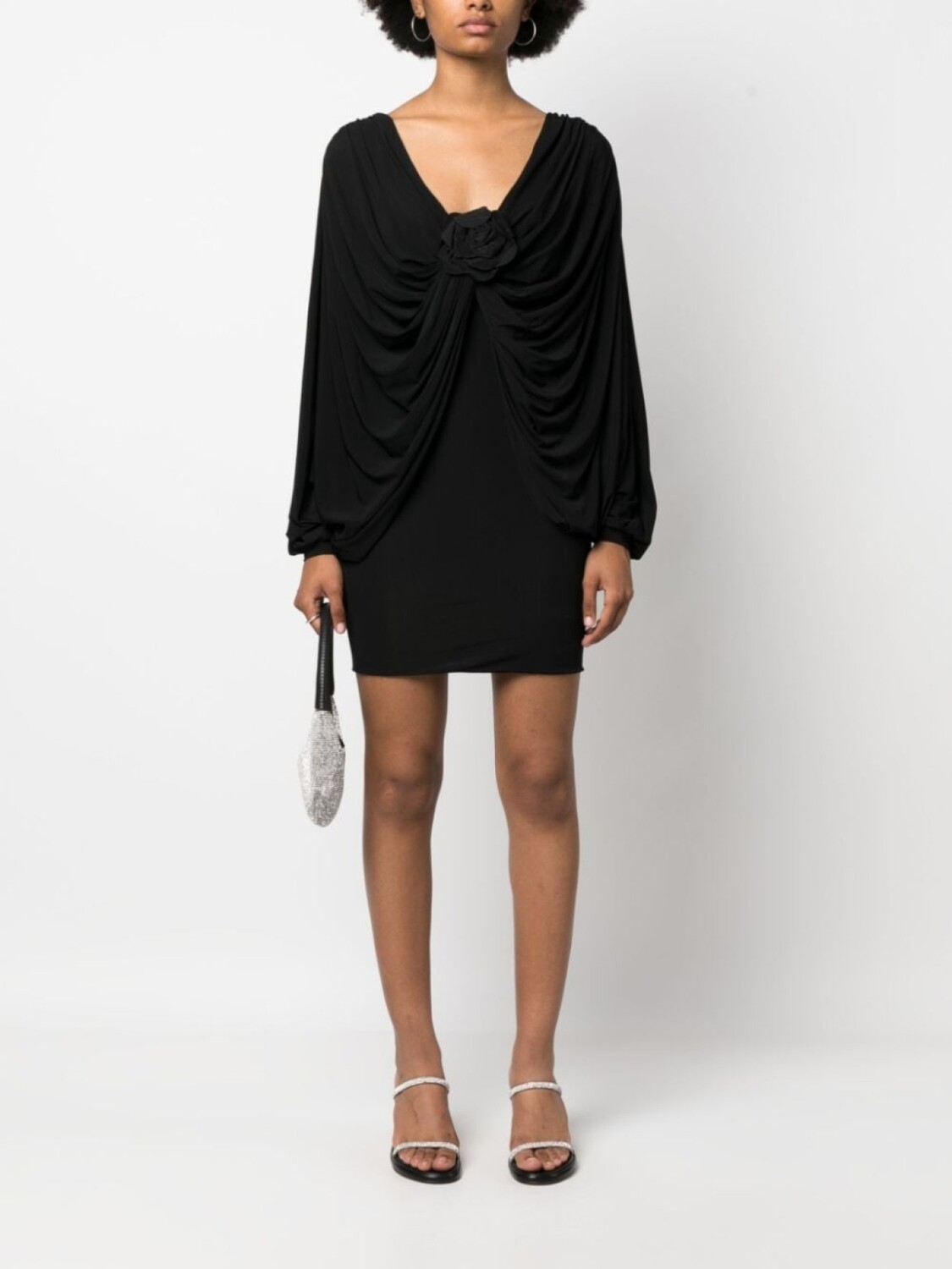 Черный, цветочная аппликация, драпировка, длинные рукава, застежка на завязке сзади и прямой подол.