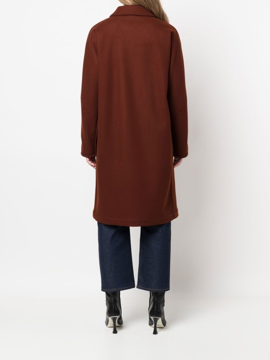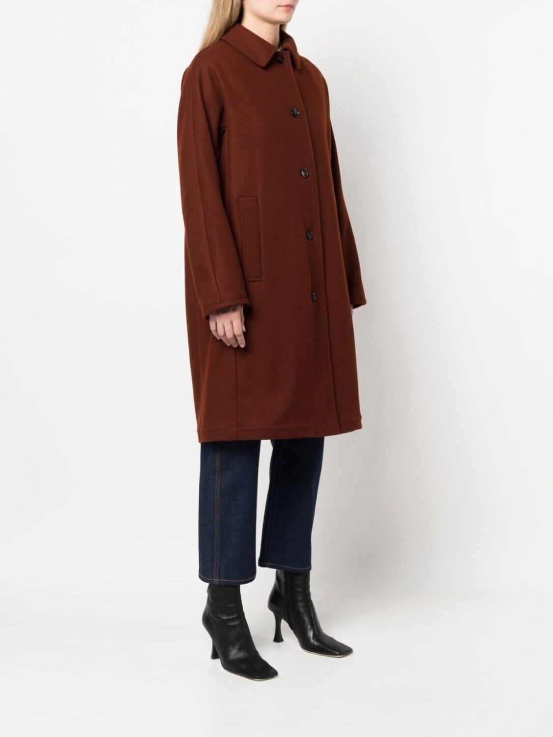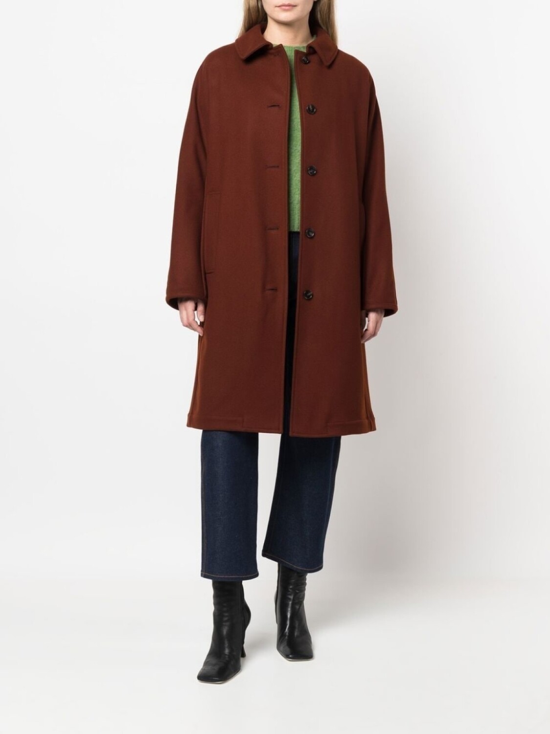 Классический воротник, застежка на пуговицах спереди, длинные рукава, два прорезных кармана по бокам и длина миди.