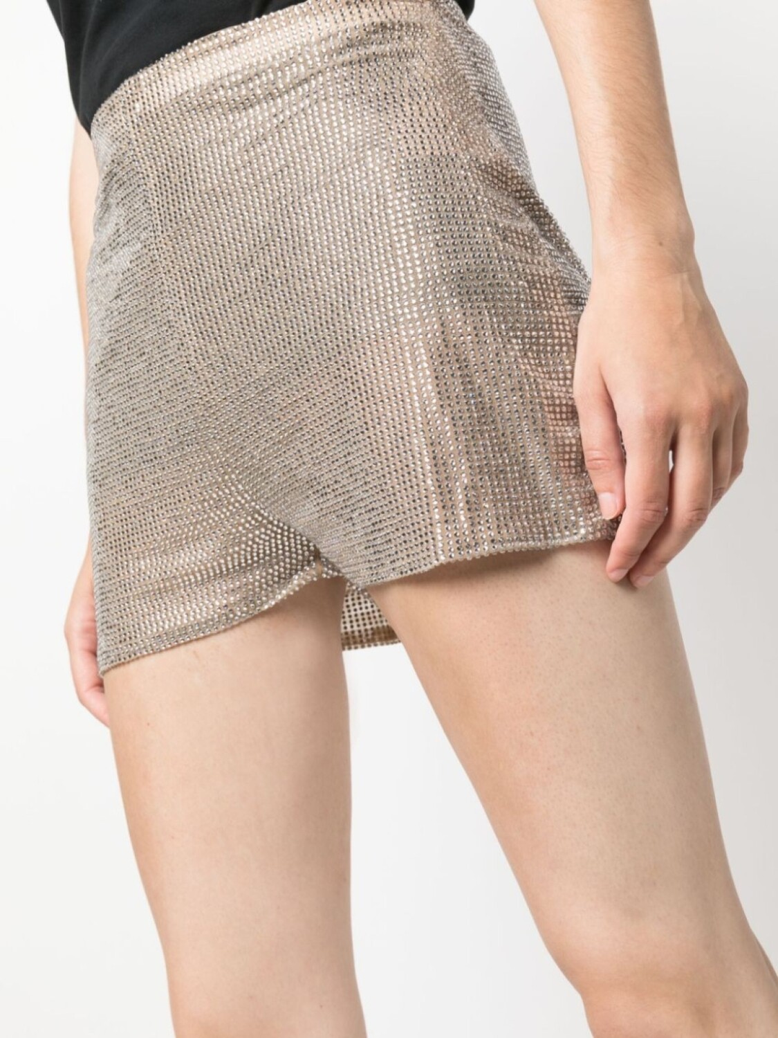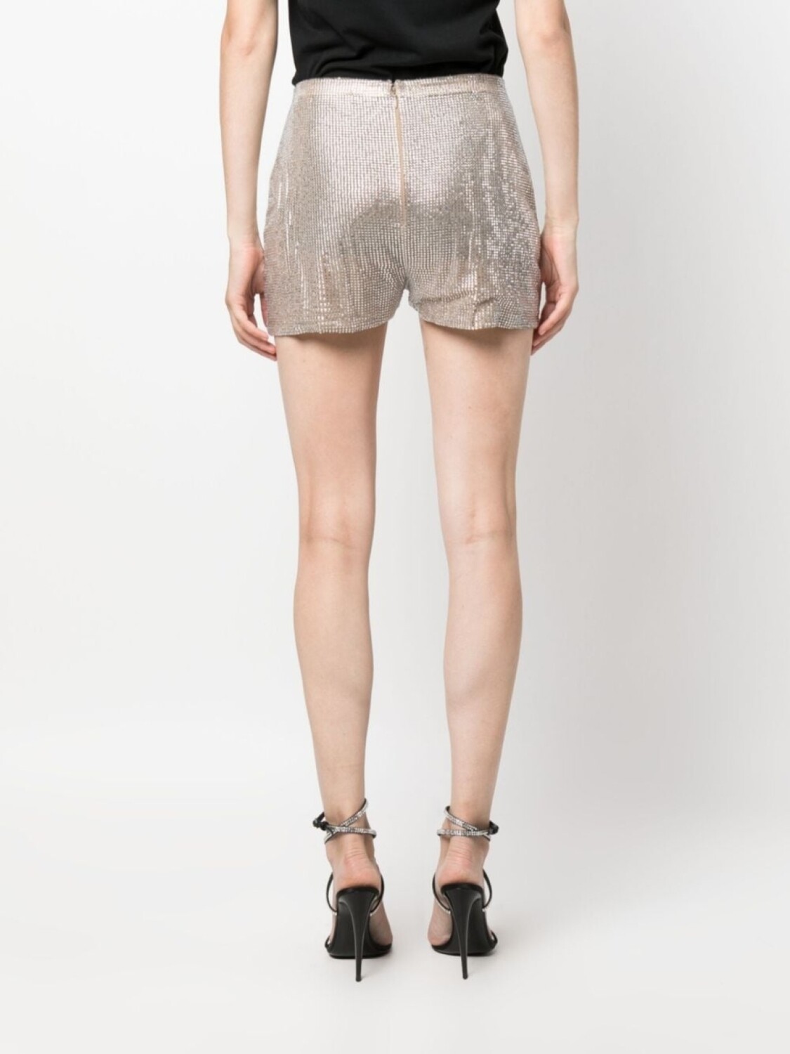 Серебристый, эластичный материал, эффект металлик, украшения из горного хрусталя, завышенная талия, застежка на молнии сзади, узкий крой, длина до бедер и длина до бедер.