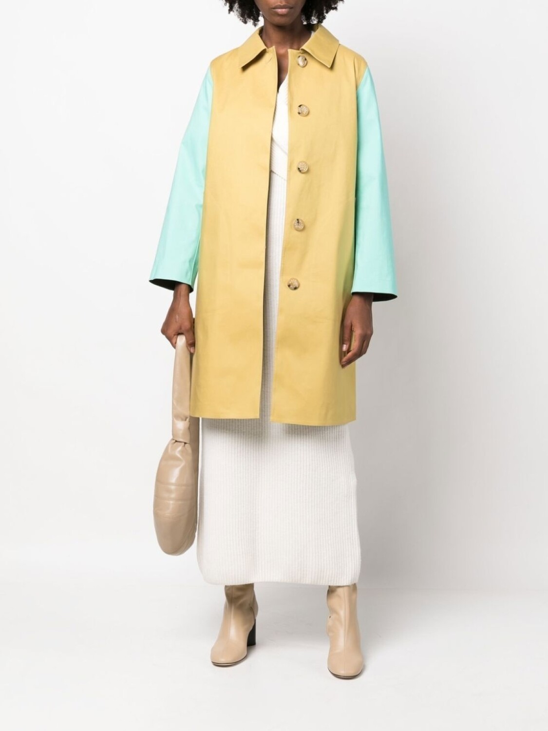 Желтый, мятно-зеленый, дизайн колор-блок, классический воротник, потайная пуговичная застежка спереди, длинные рукава, прямой подол, два прорезных кармана по бокам и длина миди.