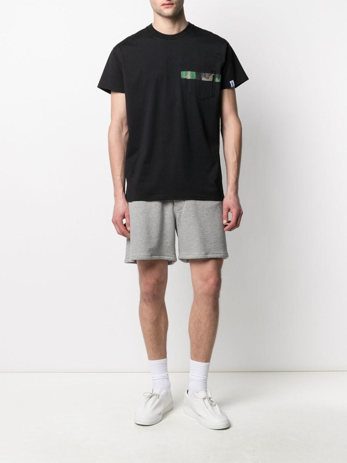 Эластичный пояс, два прорезных кармана по бокам и два передних кармана.