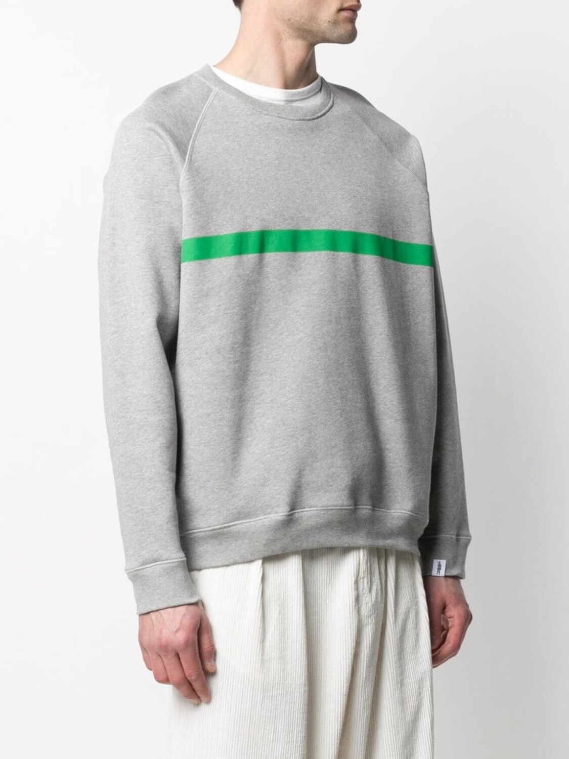 Круглый вырез, длинные рукава реглан, узор в горизонтальную полоску и нашивка с логотипом на рукаве. .