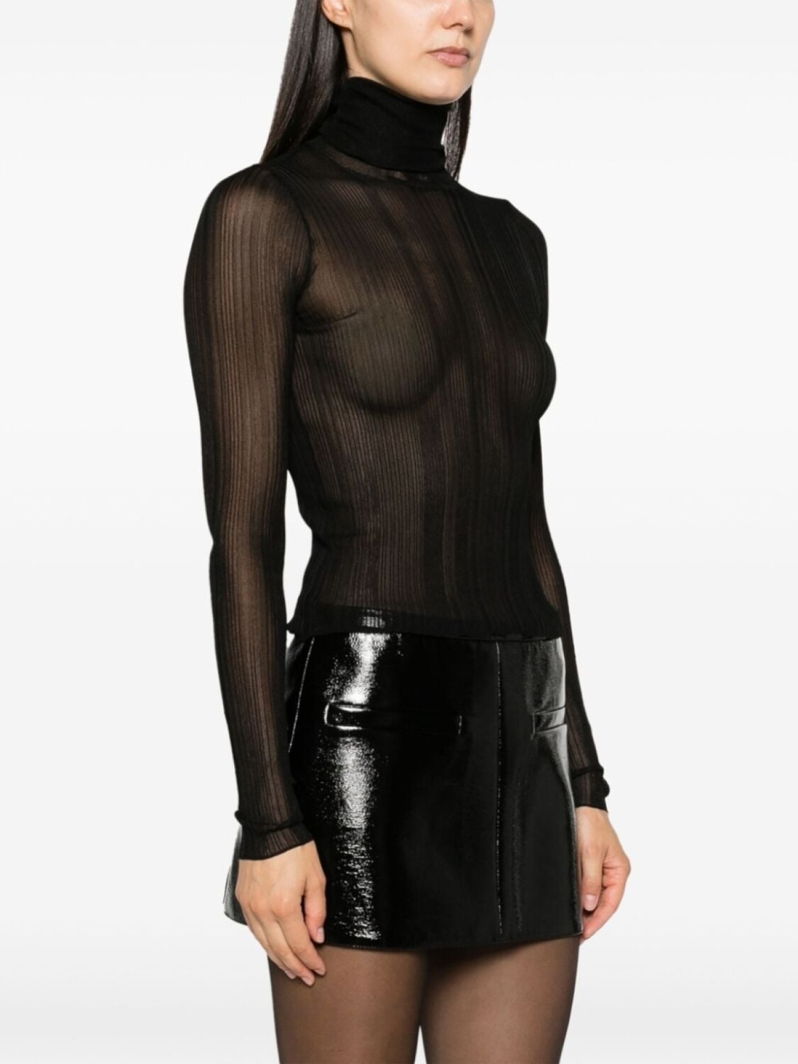 Черный, полупрозрачный дизайн, трикотаж в рубчик, высокий воротник, длинные рукава и прямой подол.