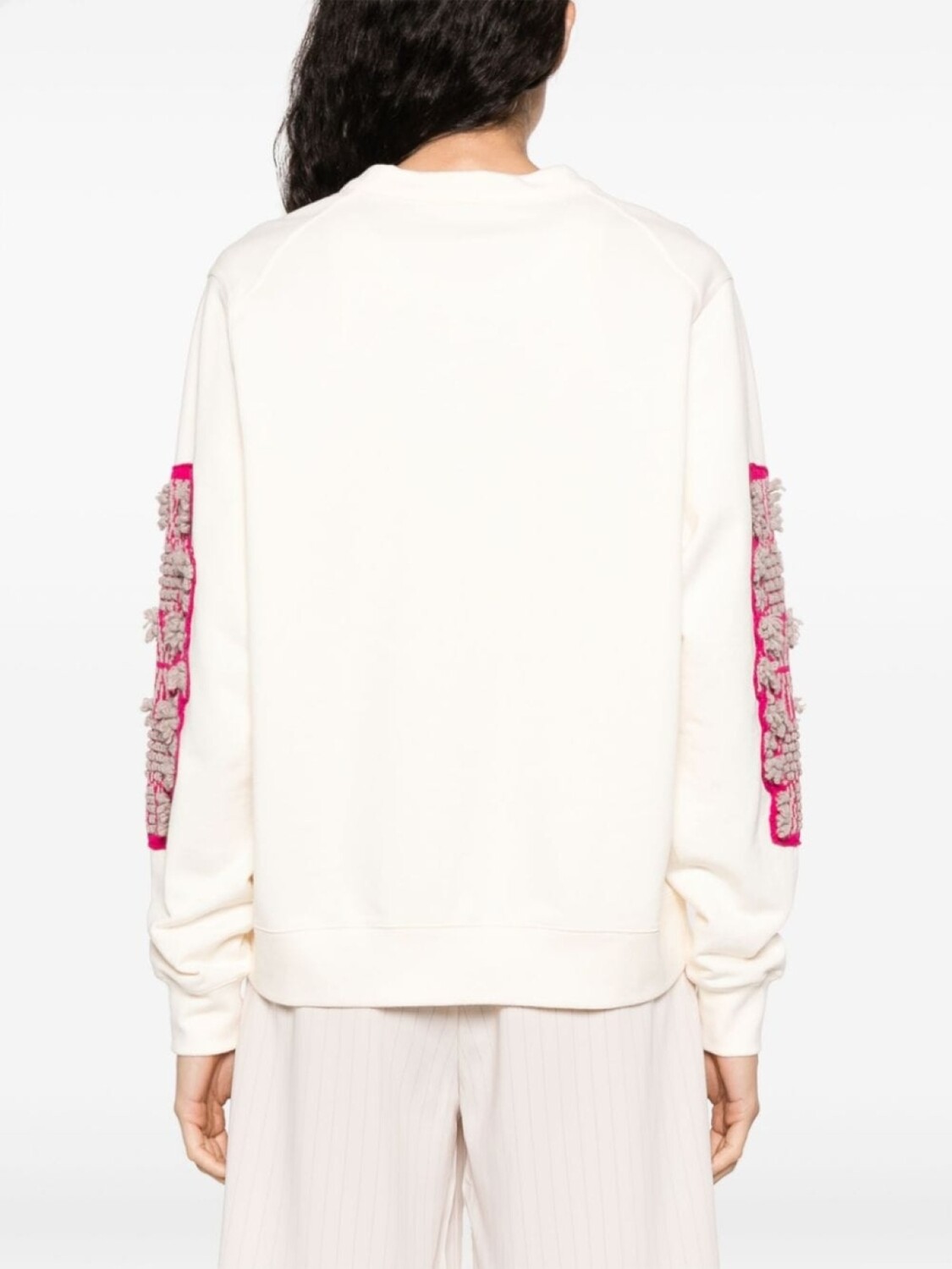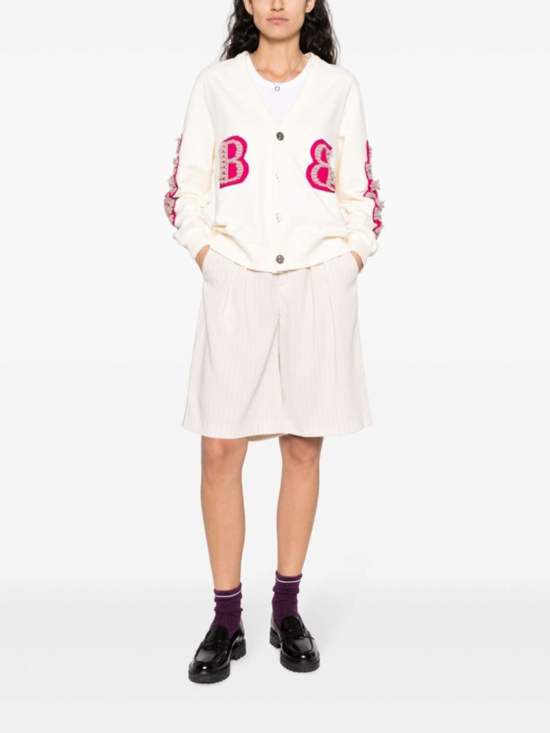 Кремово-белый, хлопок, кашемир, вышитый логотип, пуговицы с выгравированным логотипом, вышитый узор, V-образный вырез, застежка на пуговицах спереди, длинные рукава и прямой подол.