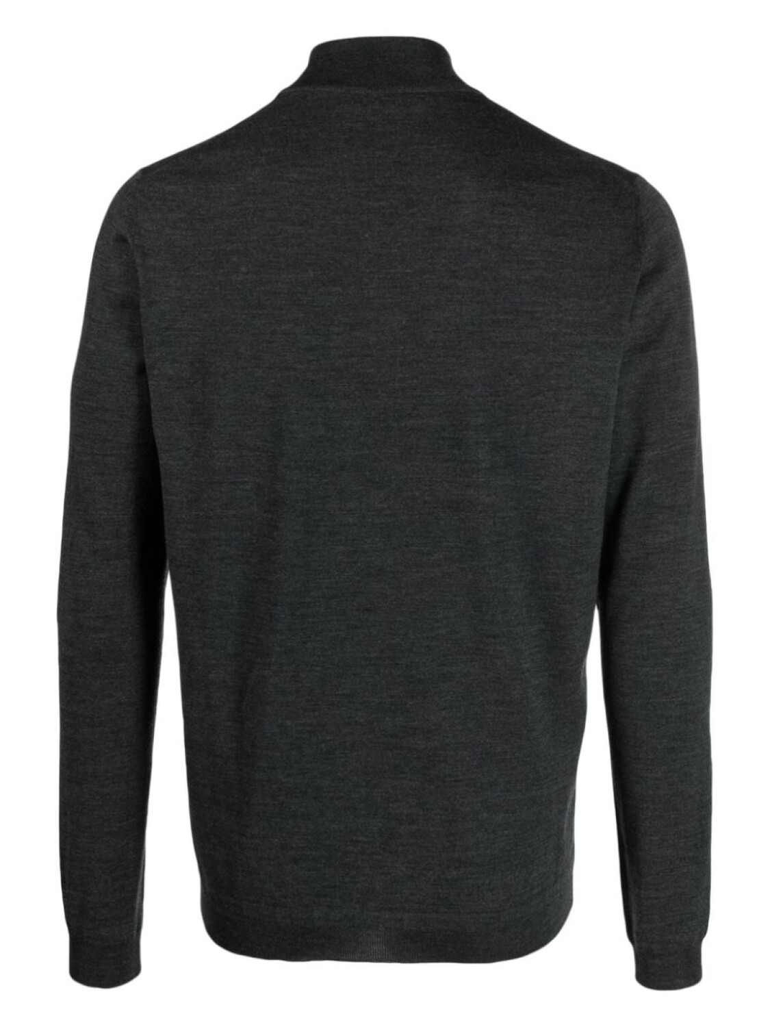 Темно-серый, шерсть мериноса, трикотажный материал, высокий воротник, длинные рукава и прямой подол.