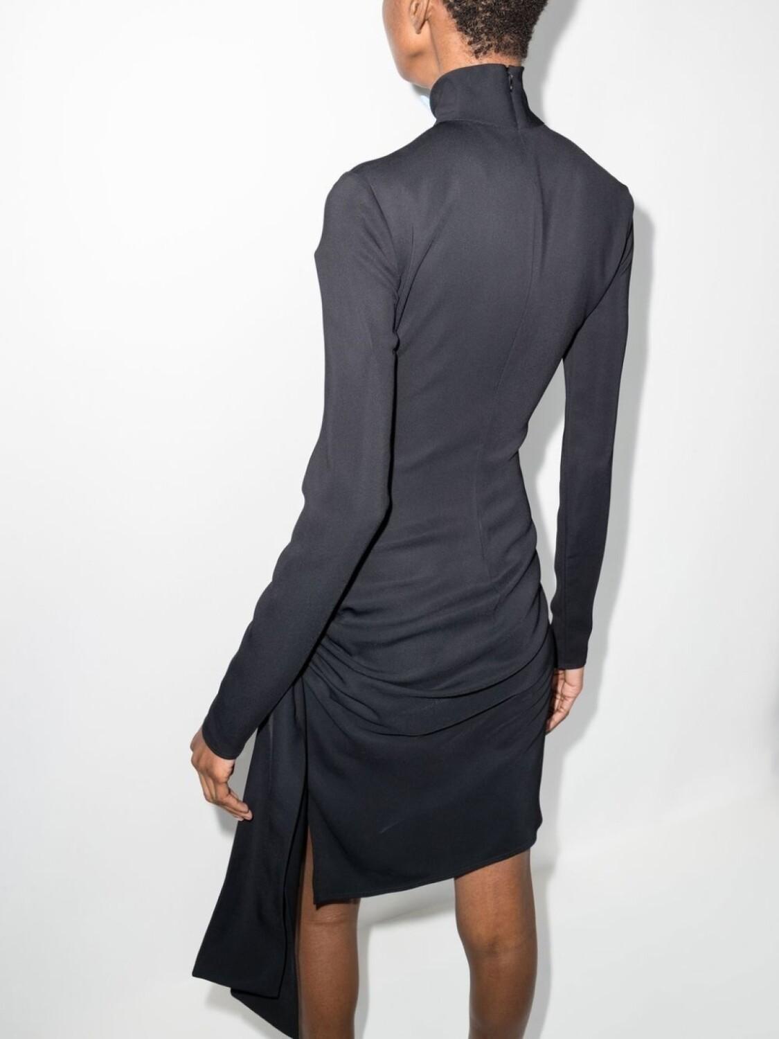 Черный, детали с оборками, драпировка, высокий воротник, длинные рукава и приталенный силуэт.