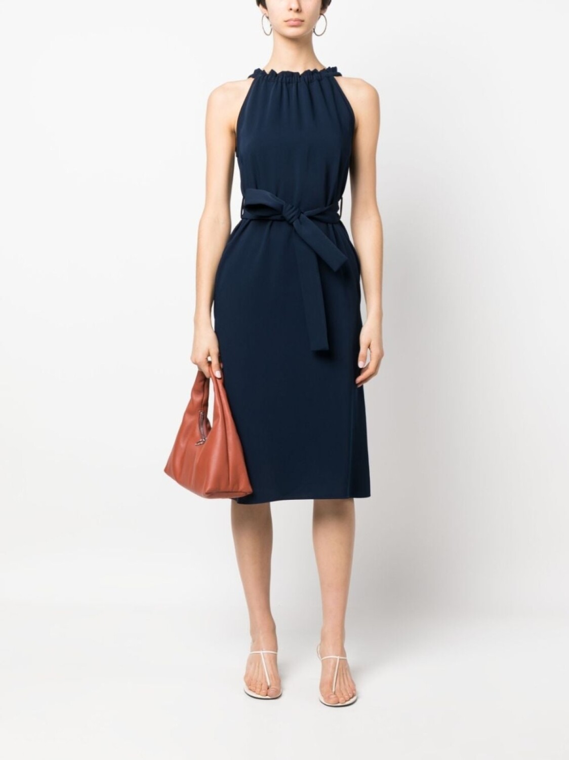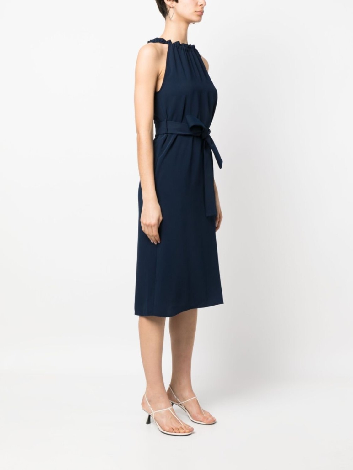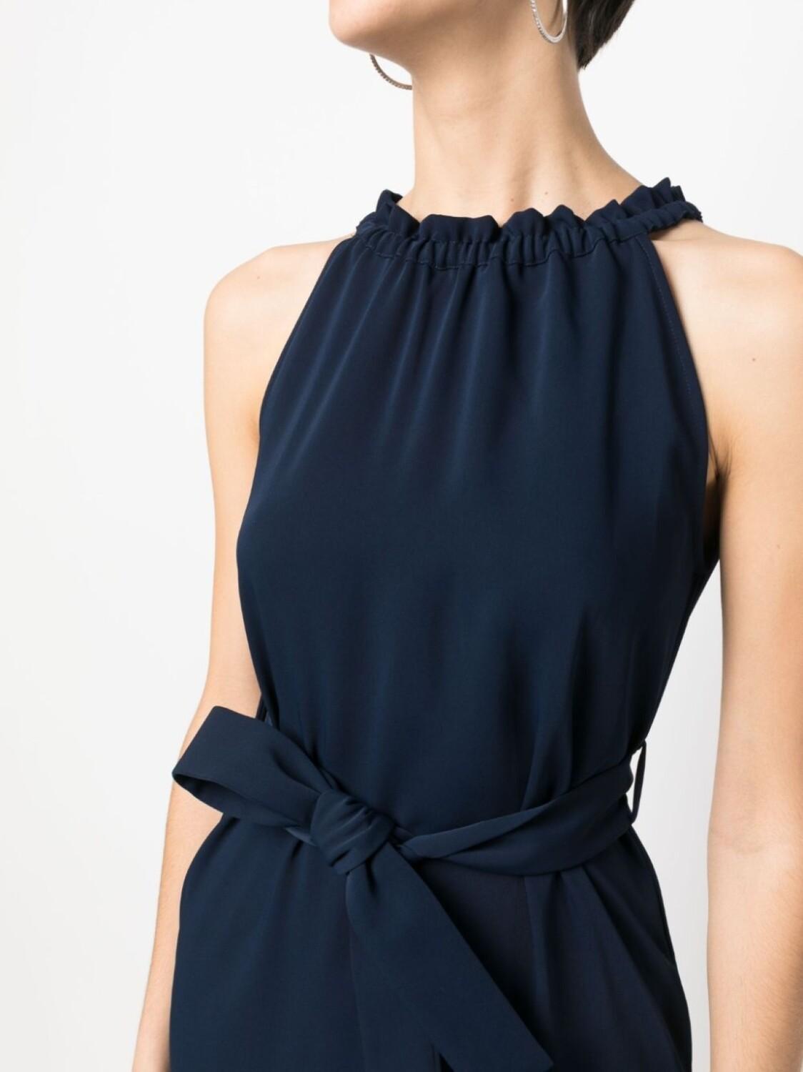 Темно-синий, воротник со сборками, вырез сзади, ремень на талии, застежка на крючок сзади, без рукавов и длина миди.
