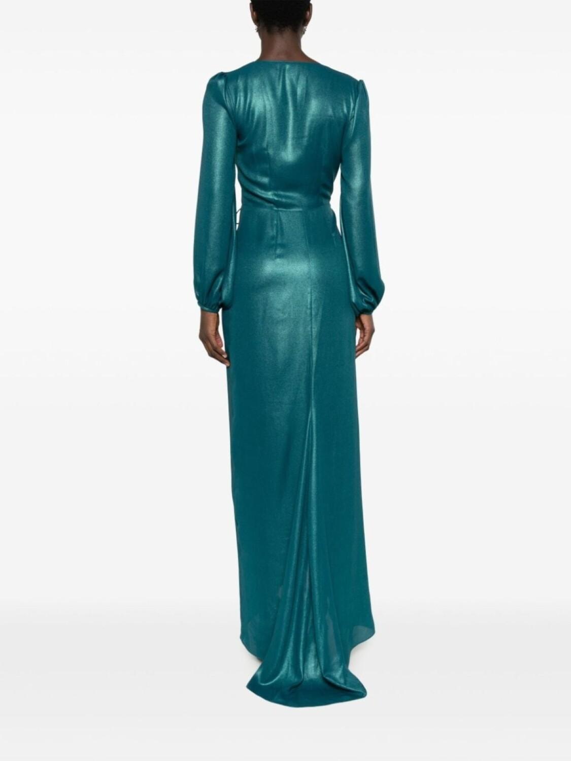 Сине-зеленый, глянцевая фактура, подол фиштейл, модель на запах, вставки с оборками, V-образный вырез, кулиска на талии, объемные рукава, асимметричный подол и длина макси.