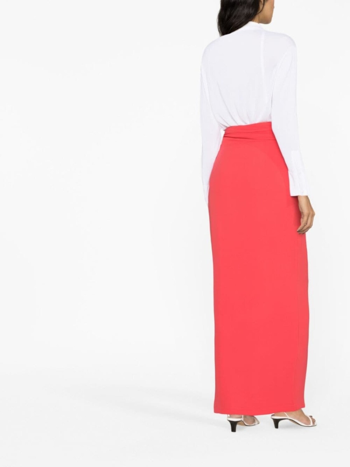 Ярко-красный, завышенная талия, кулиска на талии, разрез спереди, потайная застежка на молнии сбоку и длина макси.