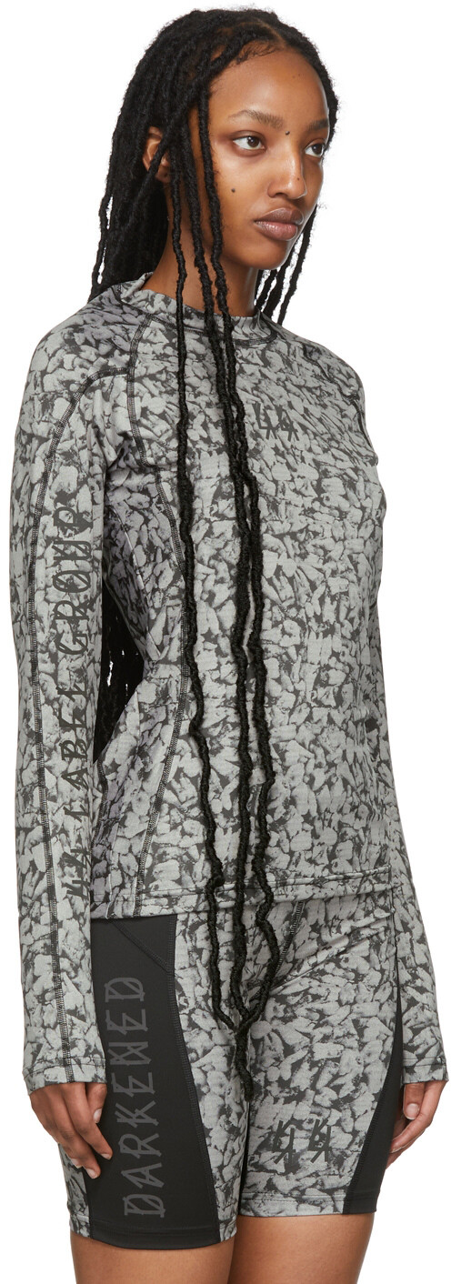 Спортивный топ из эластичного технического джерси с длинными рукавами и графическим принтом черного и серого цветов по всей поверхности.