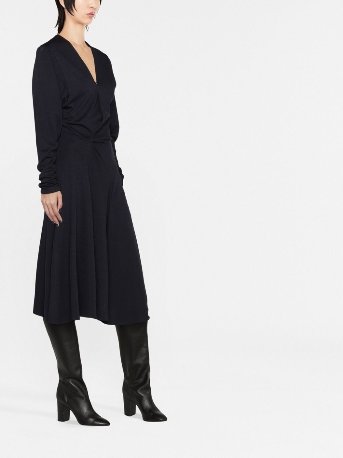 Черный, V-образный вырез, длинные рукава, детали с оборками и длина ниже колена.