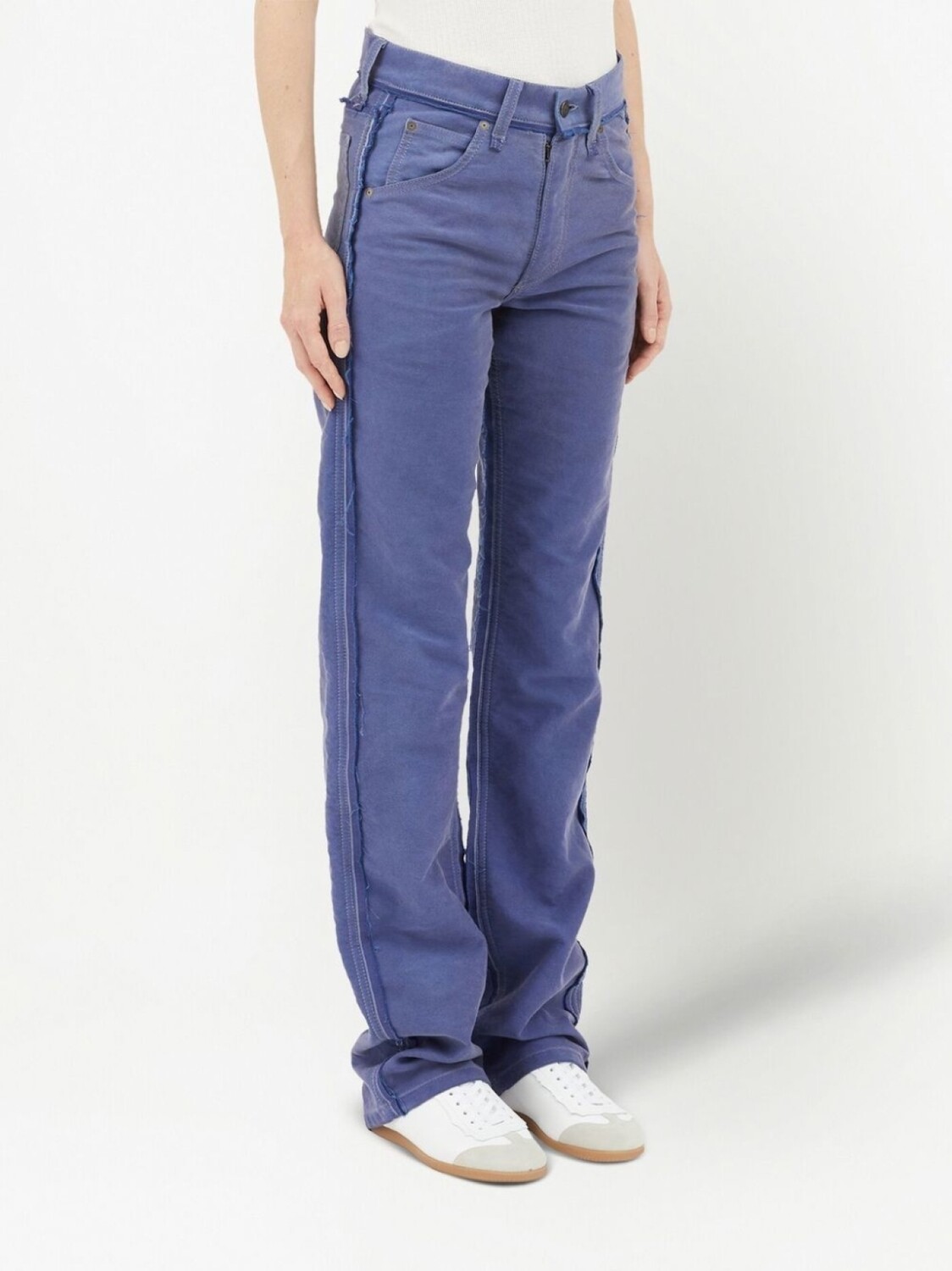 Кобальтово-синий, хлопок, необработанные детали, петли для ремня, завышенная талия, застежка на молнии и пуговице спереди, пять карманов и прямой крой.