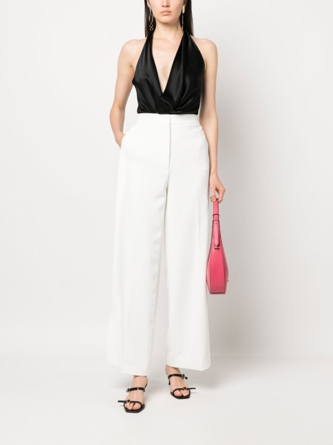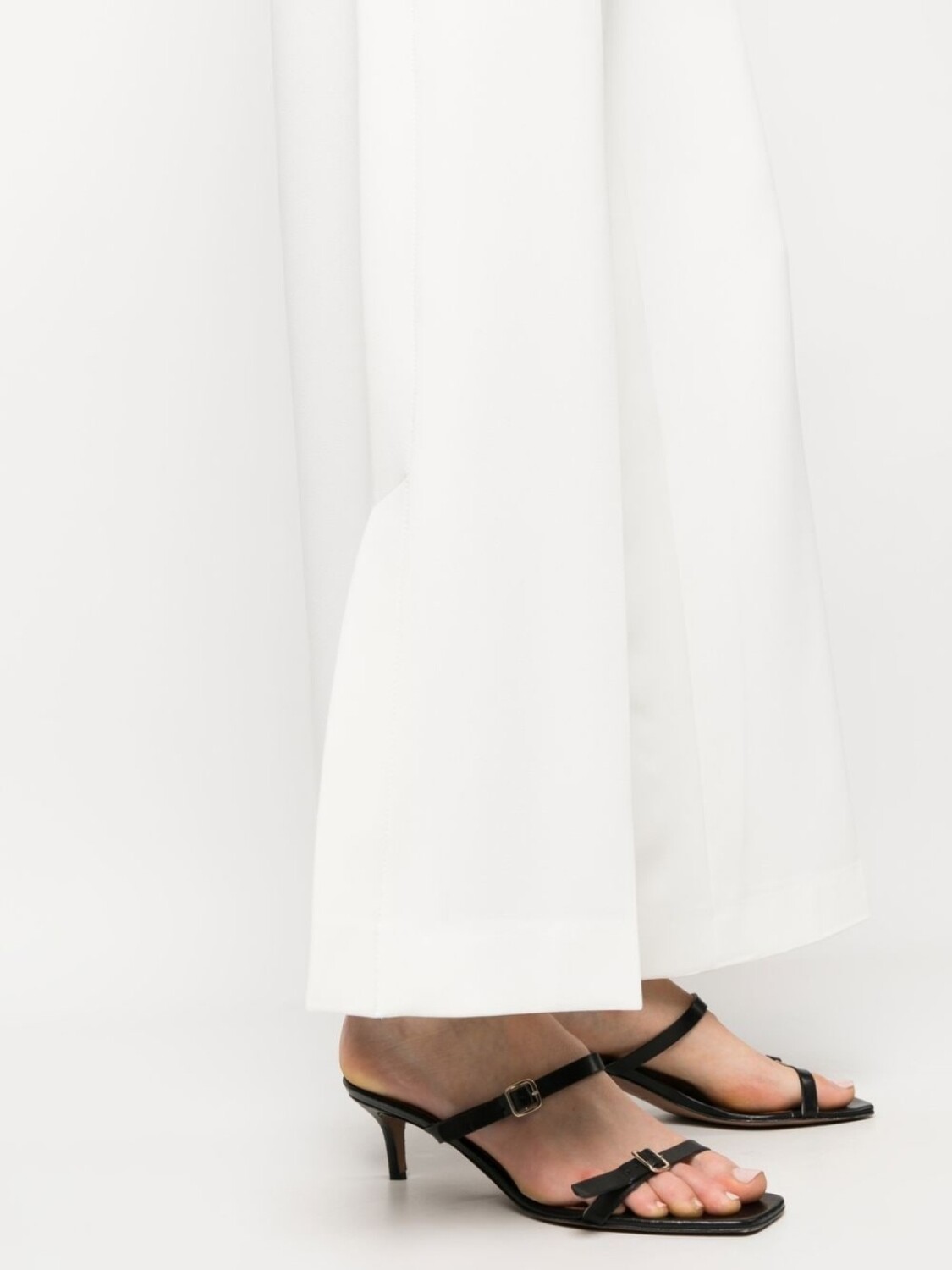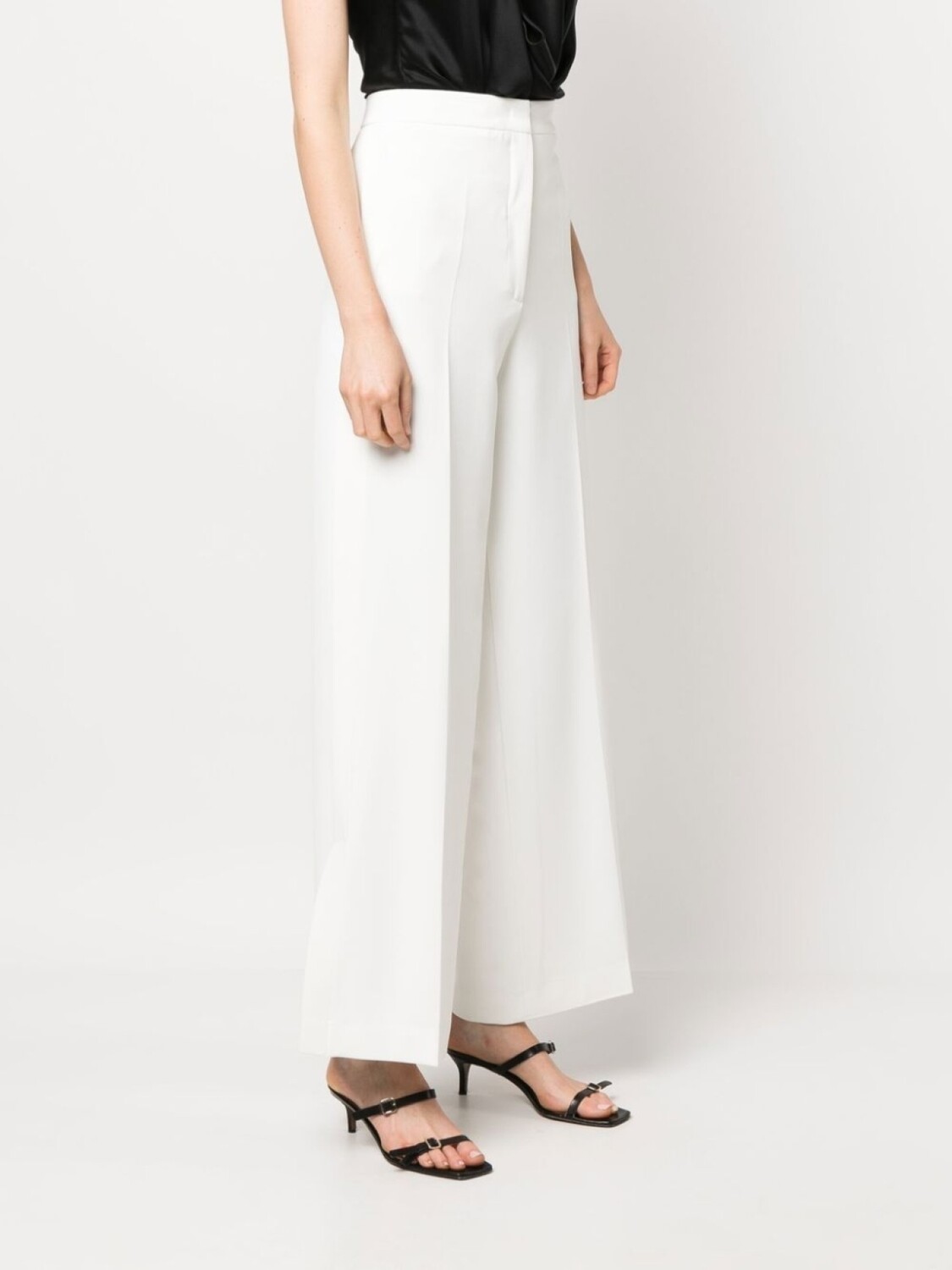 Молочно-белый, крой палаццо, модель на запах, эластичный пояс, два прорезных кармана сзади, стрелки, широкий крой и прямой подол.