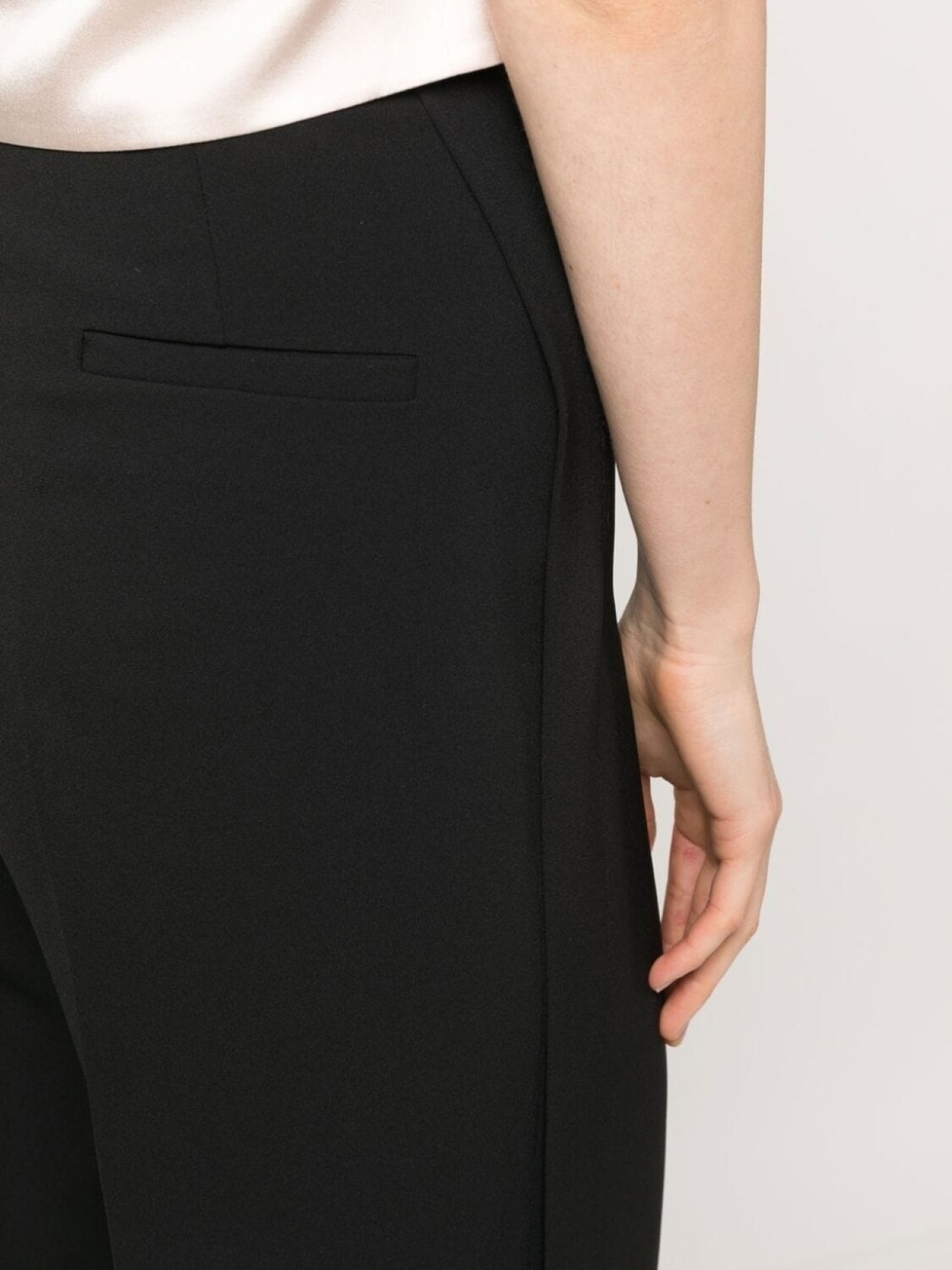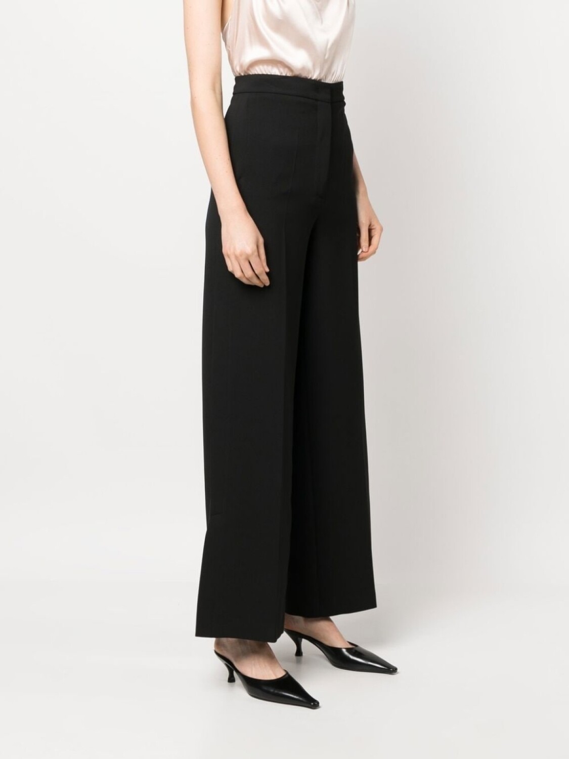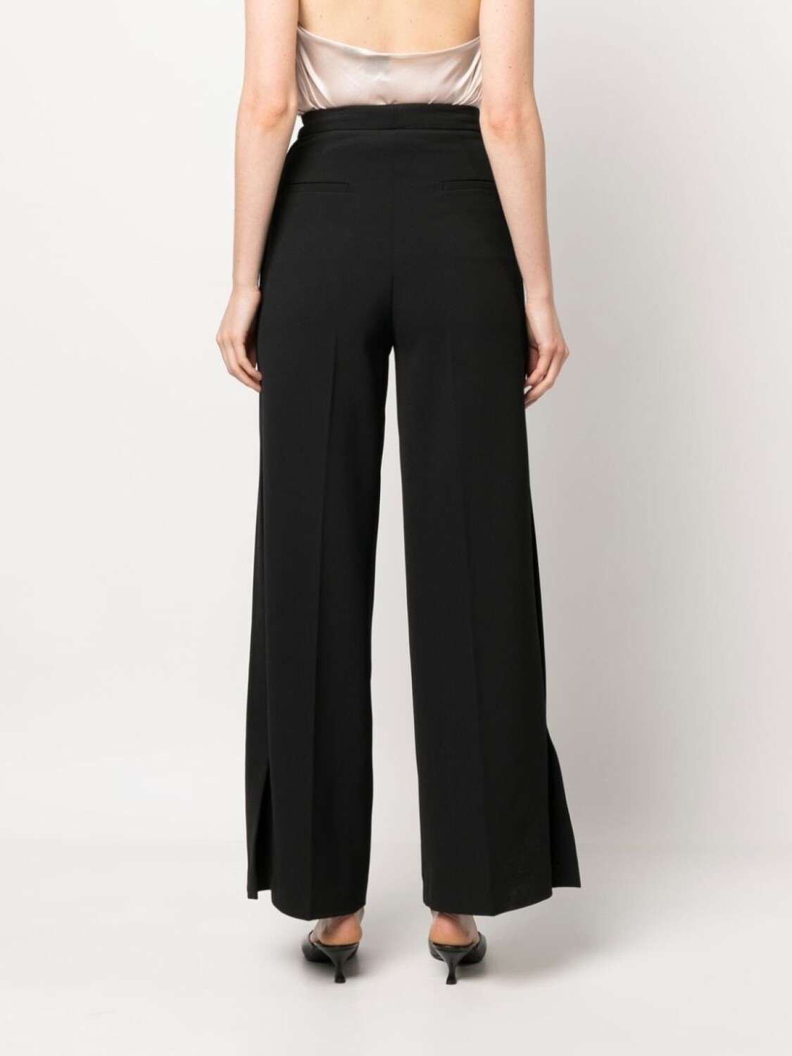 Черный, крой палаццо, модель на запах, эластичный пояс, два прорезных кармана сзади, стрелки, широкий крой и прямой подол.