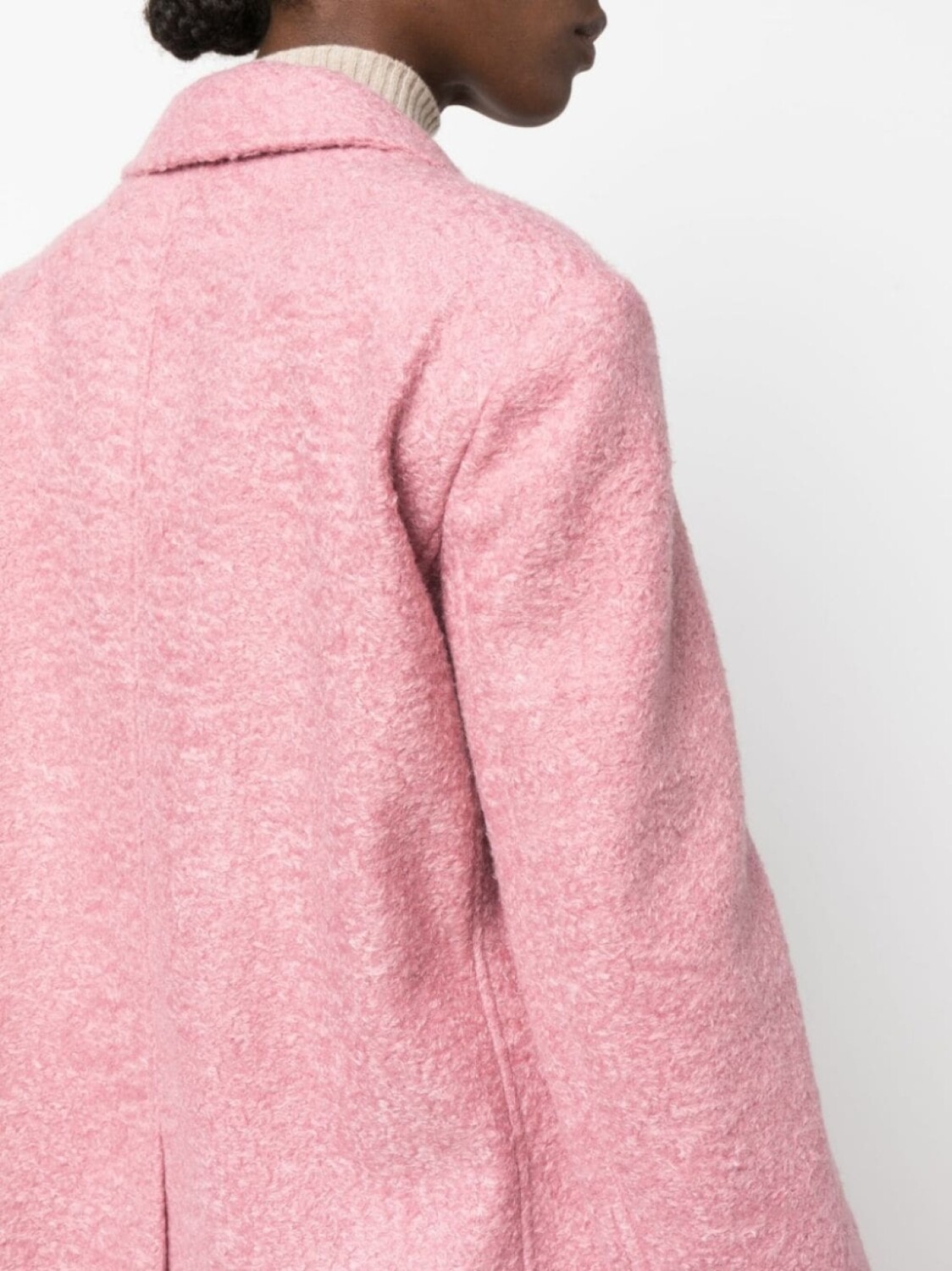 Бледно-розовый, эффект войлока, широкие заостренные лацканы, потайная пуговичная застежка спереди, приспущенные плечи, длинные рукава, прорезной карман на груди, два передних кармана с клапанами и длина ниже колена.